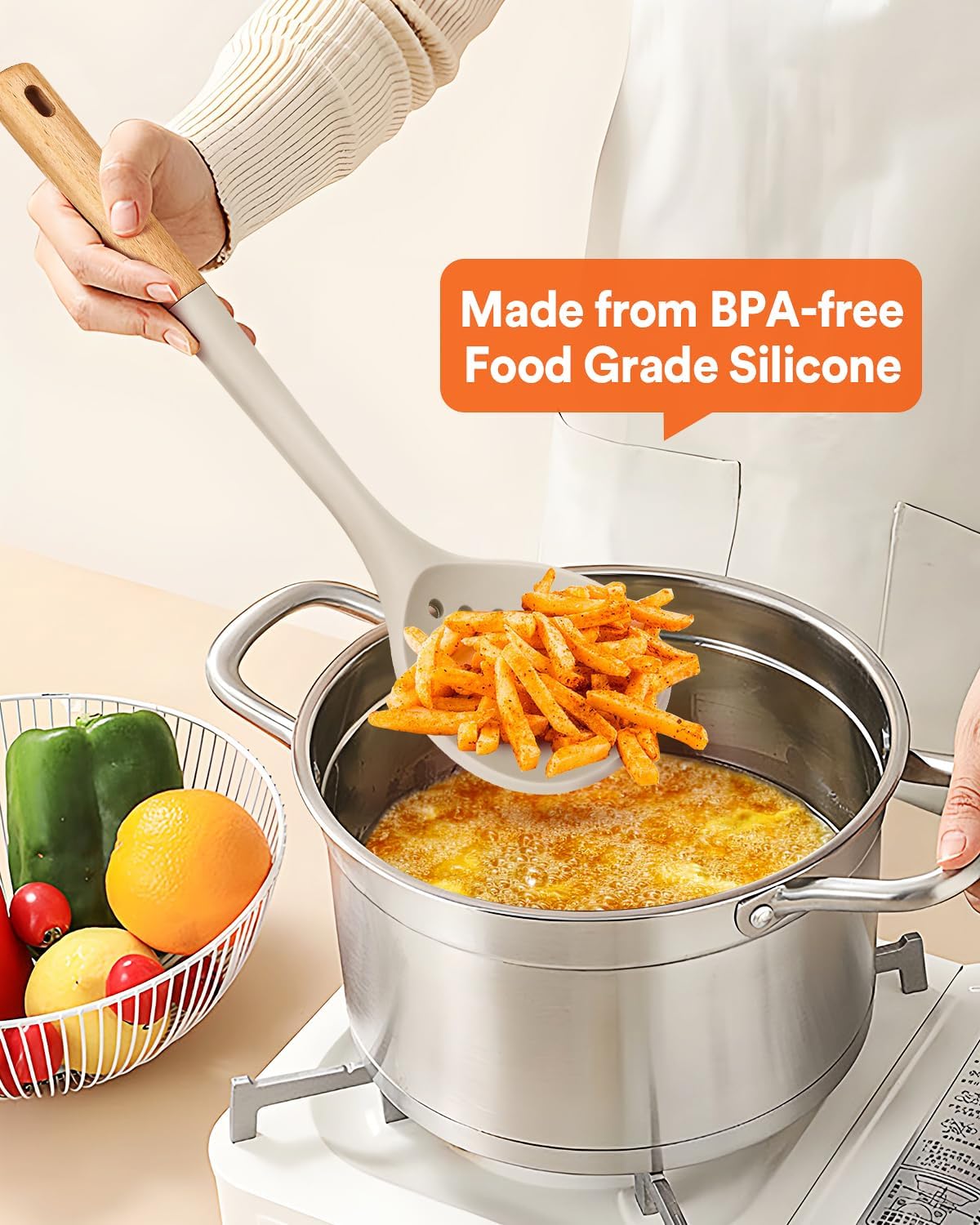 - More Safe And Healthy: Our kitchen ladle strainers are made of food-grade silicone, free of BPA. Even at high temperatures of 446℉ (230℃), there is no need to worry about melting or deforming. At the same time, the soft silicone won't scratch the coating, which can better protect your pot