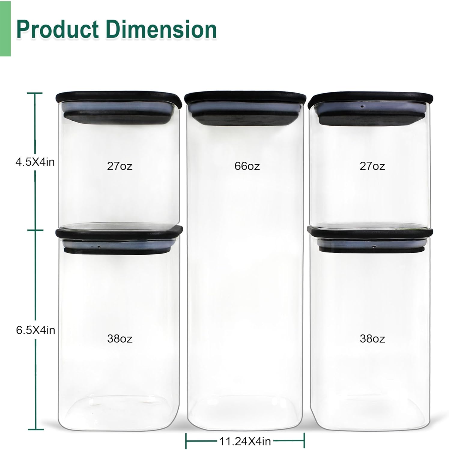 - ✅ NEW STYLISH BLACK LID SQUARE SHAPE: Looking for black and white, cool and stylish home deco? These Urban Green glass food storage canister sets with black lids are perfect for contemporary pantry design. We carefully selected 5 different sizes from 6oz to 100oz that can store any dry food, such as pasta, beans, nuts, cookies, spice or flour. Try our black lids glass jars for a new modern pantry organization.