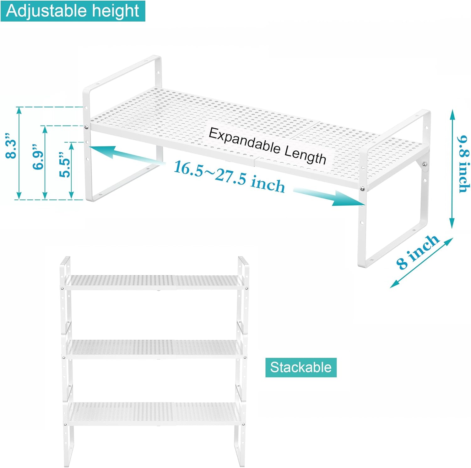 - ăExpandable and stackable designă--The Adjustable Countertop Organizer (collapsed) measures 16.5" L x 8" W x 9.8" H, expands from 16.5" to 27.5" length. You can also stack two shelves together to create a two-tier storage space.