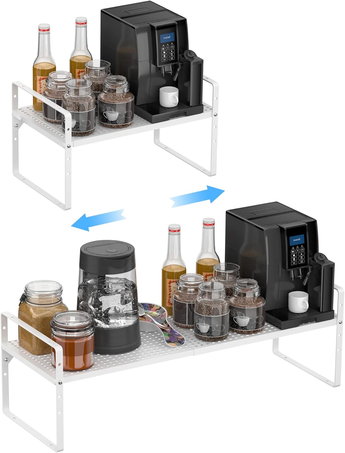 - ăExpandable and stackable designă--The Adjustable Countertop Organizer (collapsed) measures 16.5" L x 8" W x 9.8" H, expands from 16.5" to 27.5" length. You can also stack two shelves together to create a two-tier storage space.