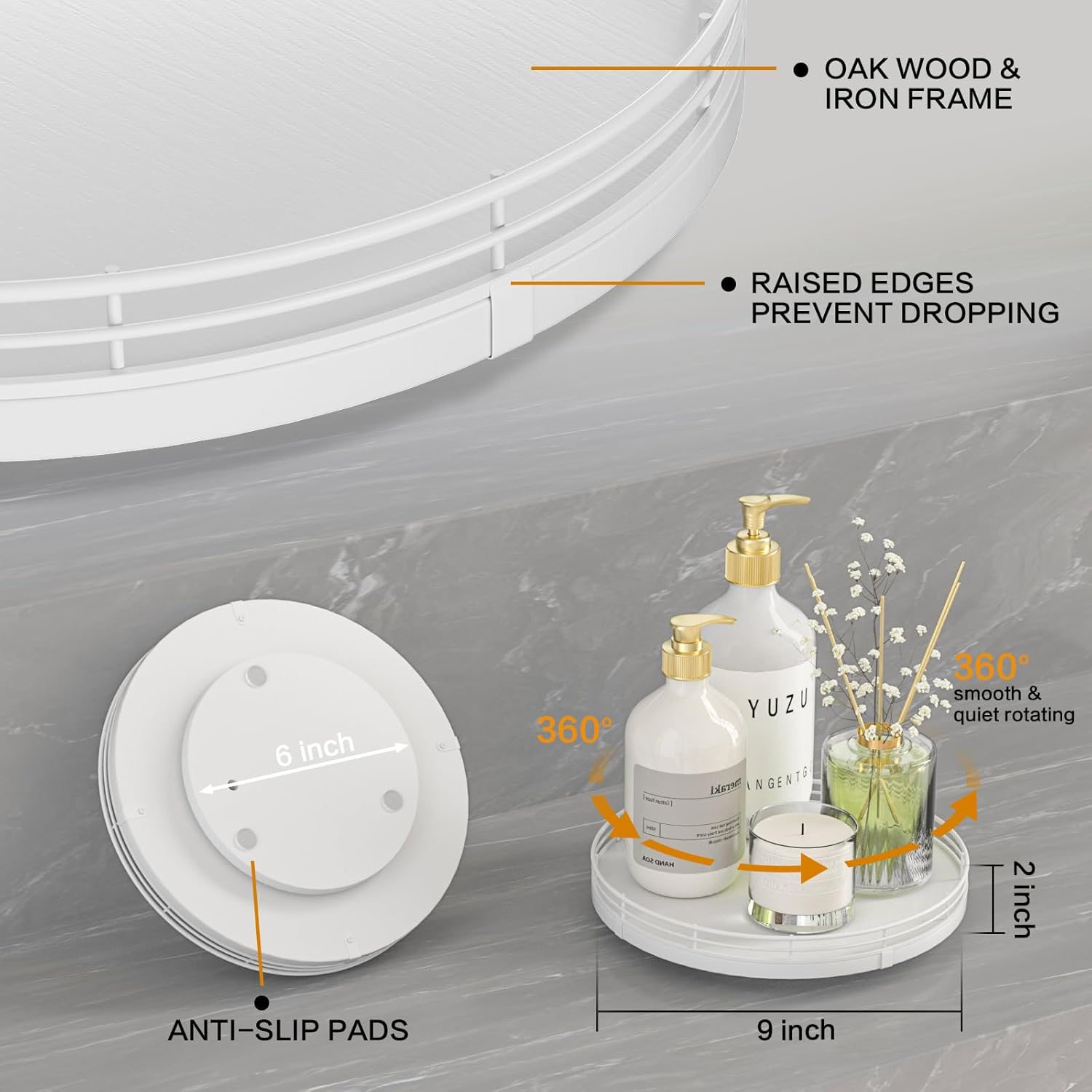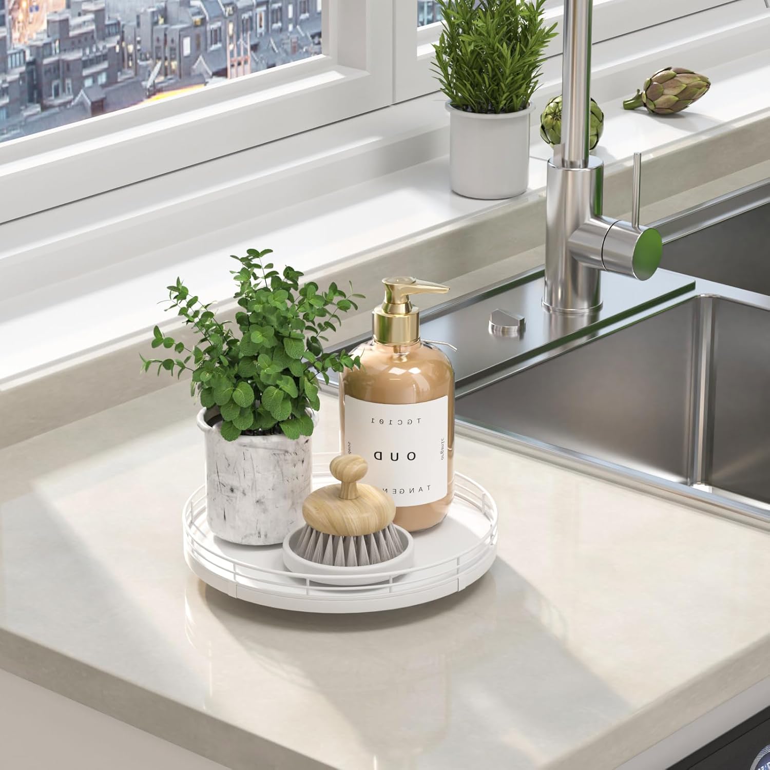 - ๐ง๐ต๐ผ๐๐ด๐ต๐๐ณ๐๐น ๐๐ฒ๐๐ถ๐ด๐ป: The turntable tray features a smooth and silent 360ยฐrotation; Bottom slip-resistant pads for stability and protect your countertop from scratches; Raised edges on each organizer tray to keep items from falling out; Easy to use, no installation required