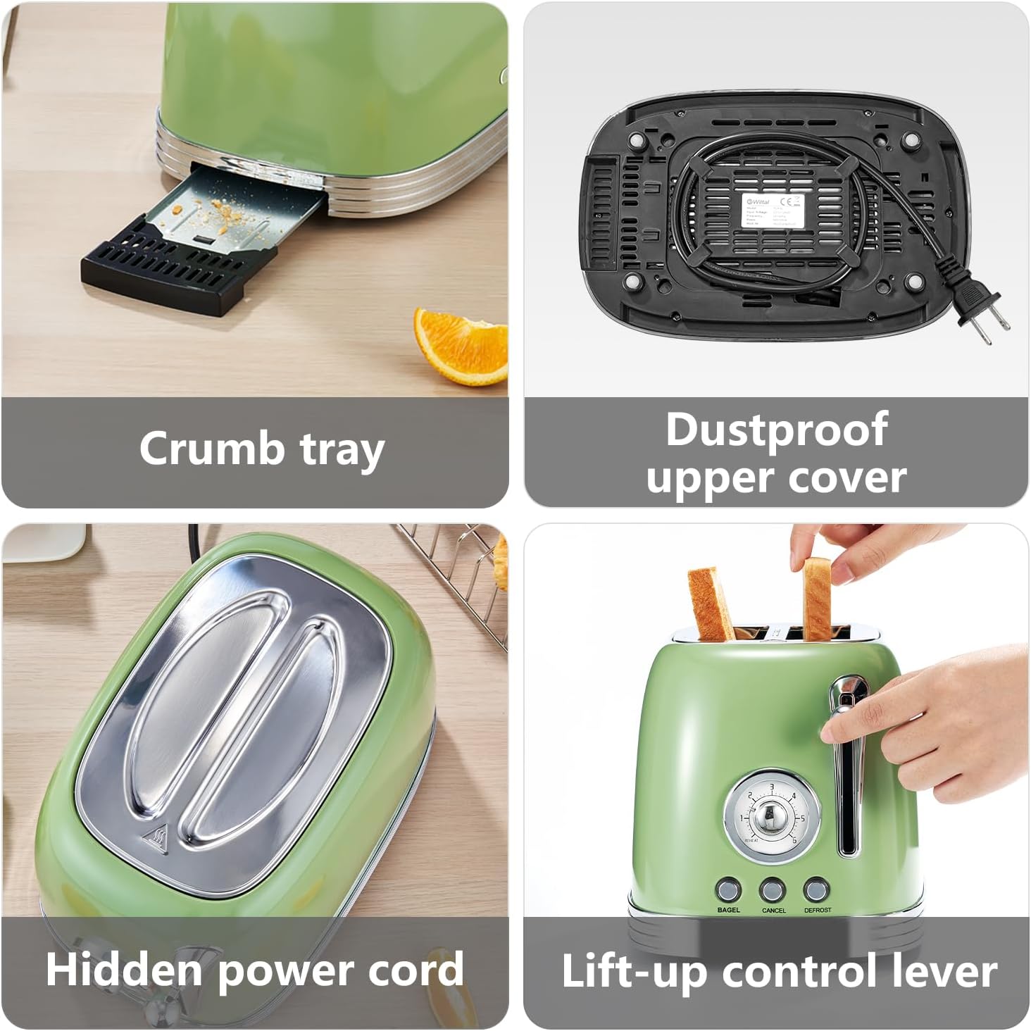 Green Cute Retro Toaster 2 Slice with 1.58" Wide Slots, with Stainless Steel Lid, with Warming Rack, Preheat, Defrost, Countdown Timer Display