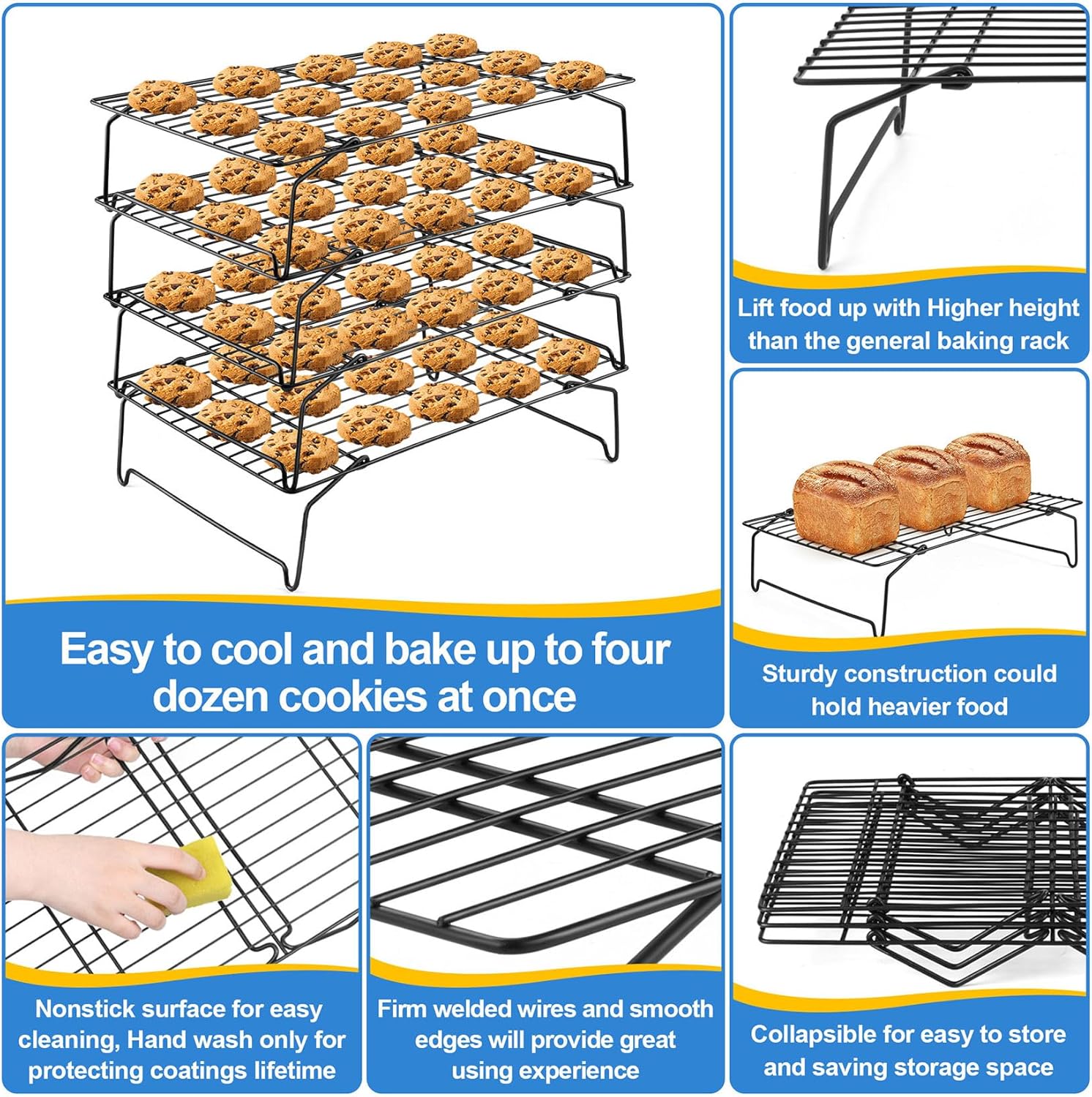 - 【UTILITY & MULTIPLE USES】Elevated feet and equidistant wires promote optimal air circulation for bake evenly and cool quickly, Heat-resistant for oven use, Each rack 15” L x 10.2” W, Fit in 16” x 11” pan, 4 Pack stackable racks have multiple uses, such as expended use, folded use and stacked use,etc, Perfect for baking, roasting, cooling and dehydrating, draining and drying