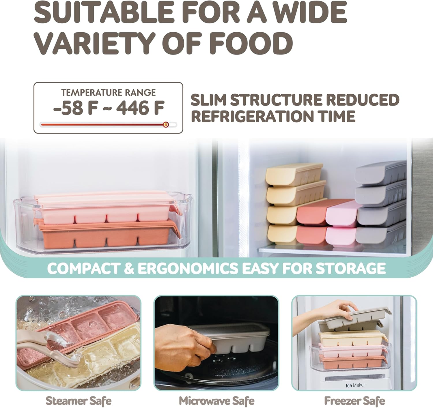 - ✅ Slim and Compact Design: These silicone freezer containers are available in 4, 6 or 12 compartments, featuring a stackable, ultra-slim and ergonomic design for easy storage. The ultra-wide area which receives cold air ensures a faster freezing process of the contents!