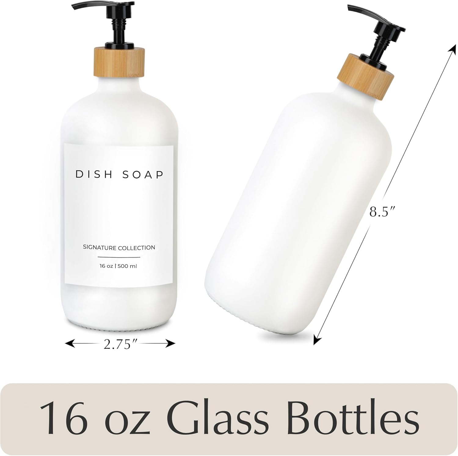 - ✅ 2-in-1 COMBO: Upgrade your home with our glass soap dispenser set. The dish soap dispensers are crafted from the highest quality glass and can be used as soap dispensers for kitchen sinks, soap dispensers for bathrooms, or as hand soap dispenser of your favorite liquid. The kitchen soap dispensers come with 2 dish soap dispensers for kitchen bottles (16 ounces), 2 stainless steel pumps, and 5 waterproof labels. Our selection includes colors including amber, clear, white, and black.