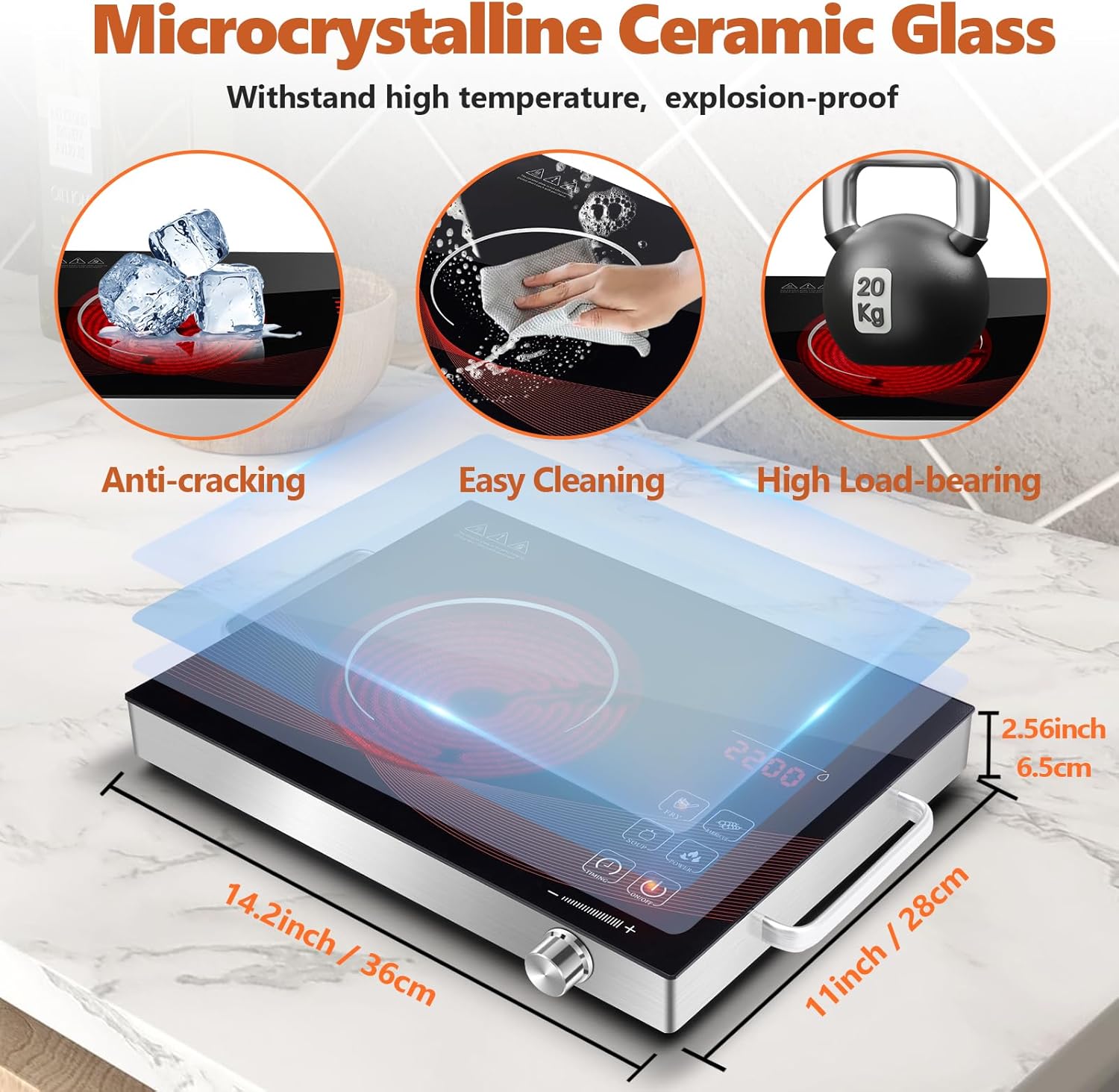 - PORTABLE AND EASY CLEANING - Featuring compact design and carrying handle, this portable stove top electric is perfect for apartments, RVs, gardens, and camping. The sturdy brushed stainless steel body combined with an easy-to-clean glass panel enhances the aesthetic appeal of the infrared hot plate and simplifies cleaning.