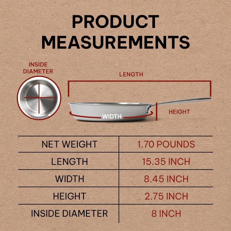 - PREMIUM STAINLESS STEEL CONSTRUCTION WITH TRI-PLY BASE - Professional-grade 18/10 stainless steel with thick aluminum core ensures perfect heat distribution. Our 8" skillet eliminates hot spots for consistent cooking results every time. Scratch-resistant surface maintains its elegant appearance for years, outlasting traditional non-stick pans.