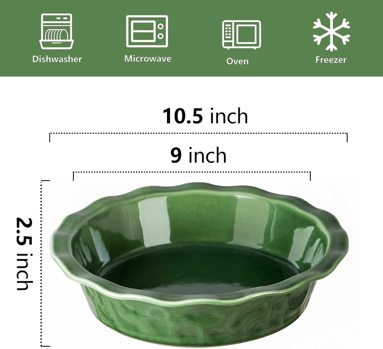 Vicrays Ceramic Pie Pan - 9 Inch Round Fluted and Deep Pie Dish for Tart Pizza Quiche Pot Pies Cake - Reactive Glaze (Green)