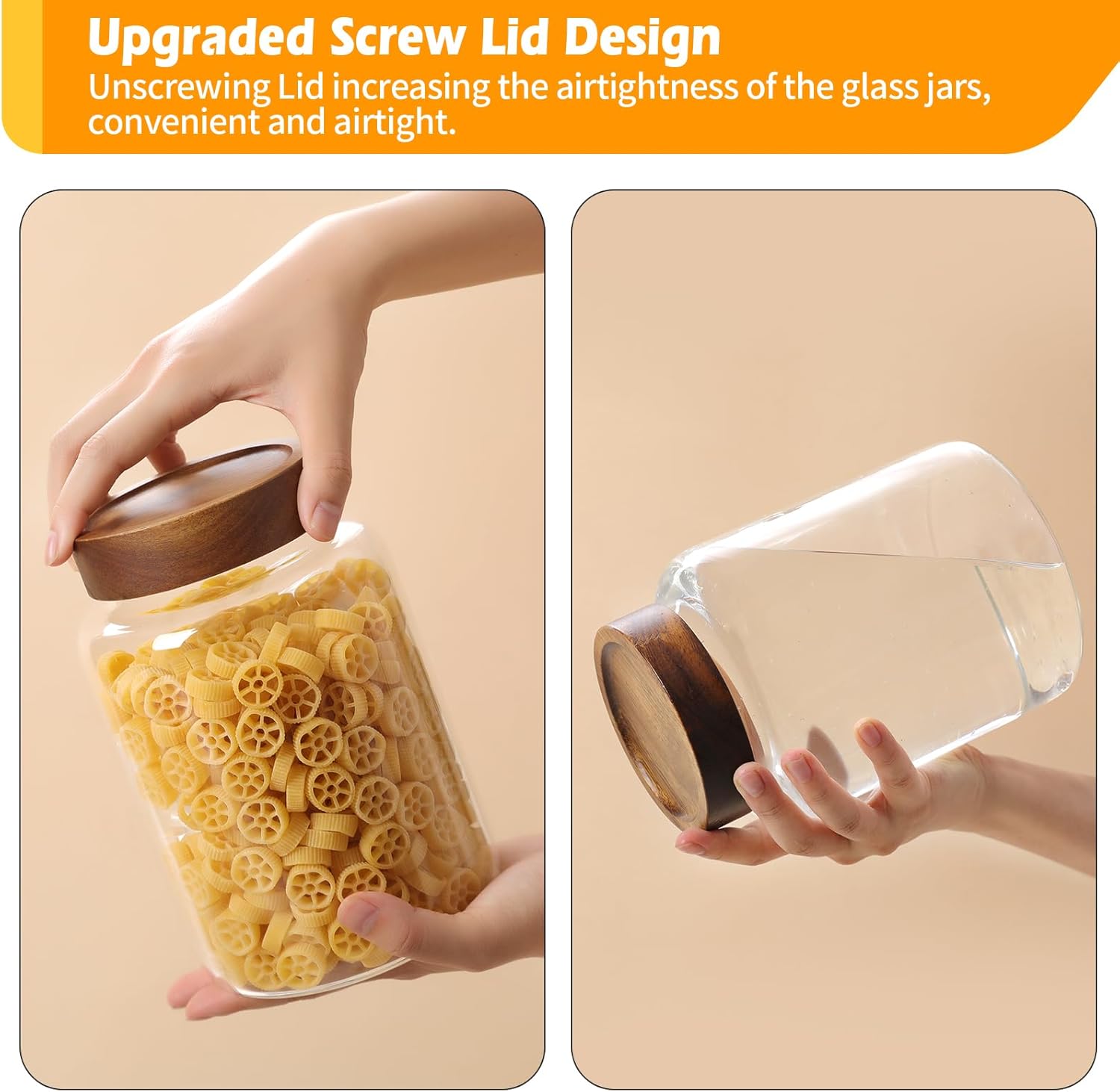 - 【WIDE APPLICATIONS】 Glass kitchen canisters for pantry organization and storage are suitable for storing various dried ingredients to retain their freshness, with clear glass jars, you can easily see inside and quickly find the ingredients you need.Glass jars with wood lids perfect for storing dry food , such as,cookies,dried beans,pepper,oatmeal,jams,chutneys, rice, flour, tea, coffee, biscuits, candy,cheese,flour, sugar, seeds,etc. Keep your kitchen tidy and safe,saving space and convenient .