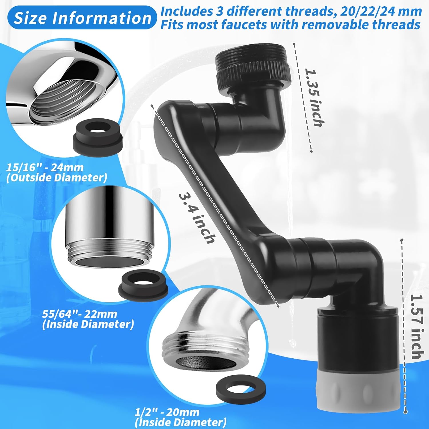 - 【Universal Thread and Tools】Compatible with most bathroom/kitchen/laundry sink faucets, the Longing Home Faucet Kitchen Sink Aerator offers 3 diameter sizes of connections: 55/64"-27T (22mm) female thread, G1/2 (20mm) female thread, 15/16" (24mm) male thread. The sink faucet extender and faucet extender for kitchen sink for added versatility.