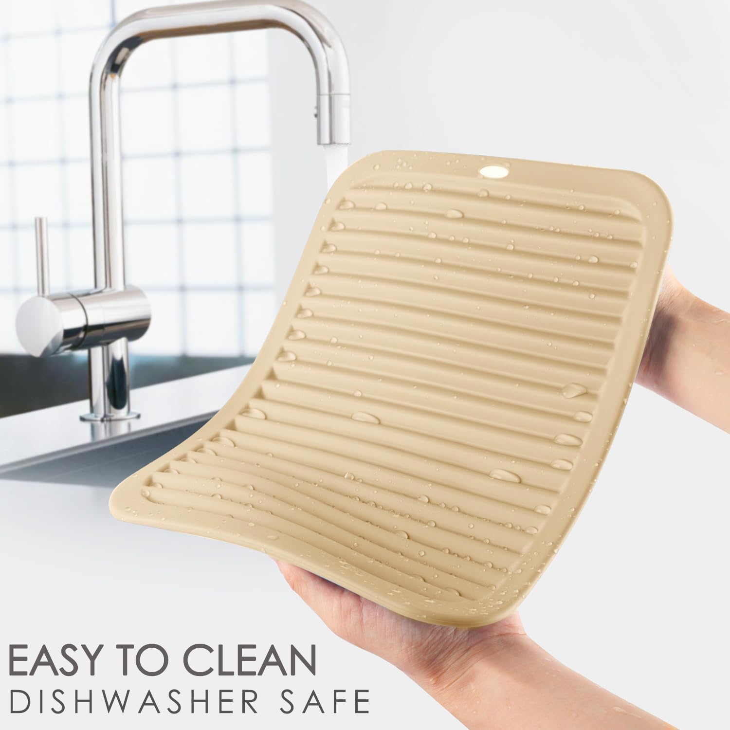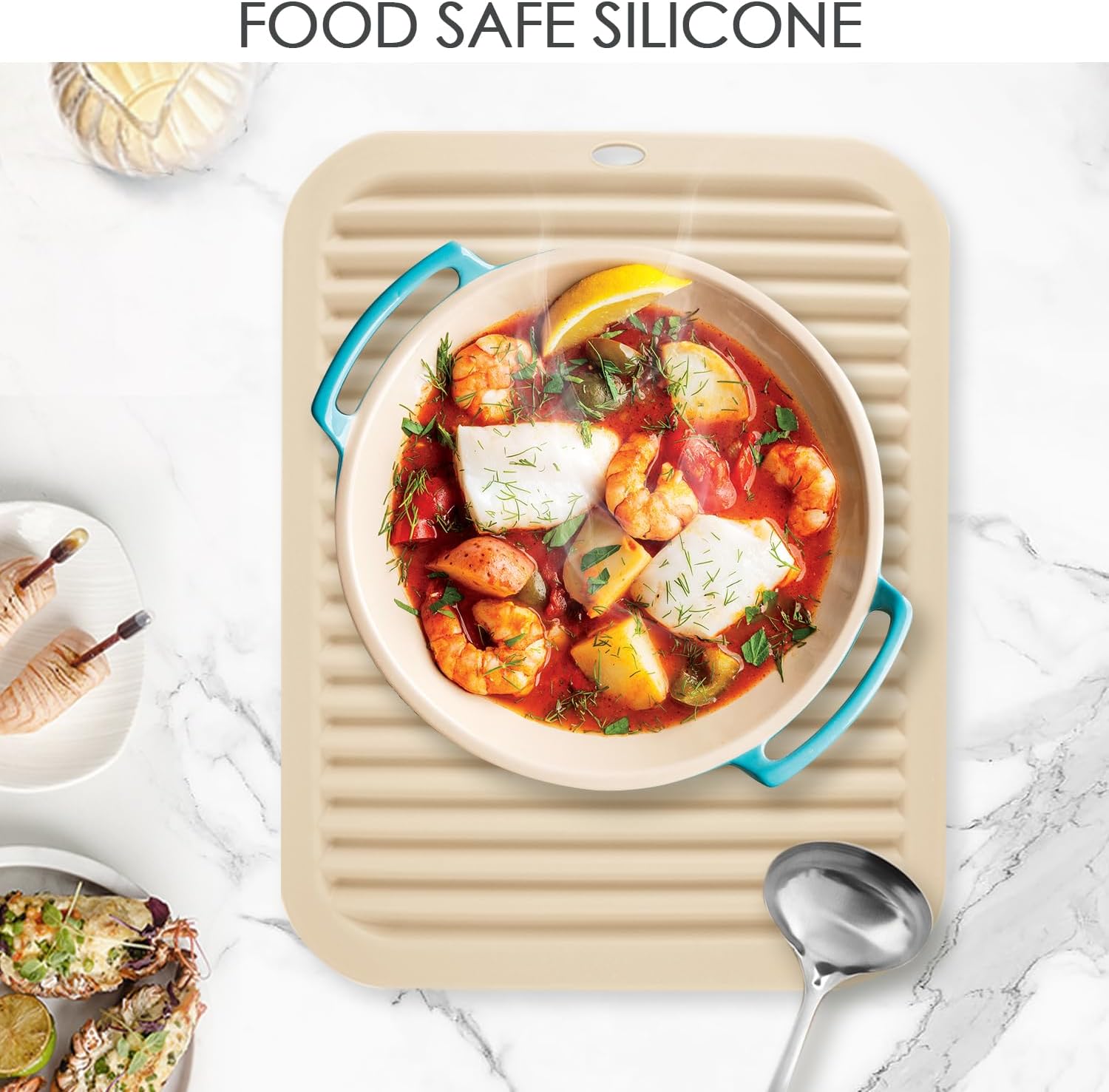 - 【EASY TO CLEAN & STORE】: The beige silicone pot holders for kitchen are easy to clean, wipeable, and dishwasher safe. Almost everything can be easily washed off from surfaces and dry quickly. Roll up or hang it on a hook; save valued kitchen space!