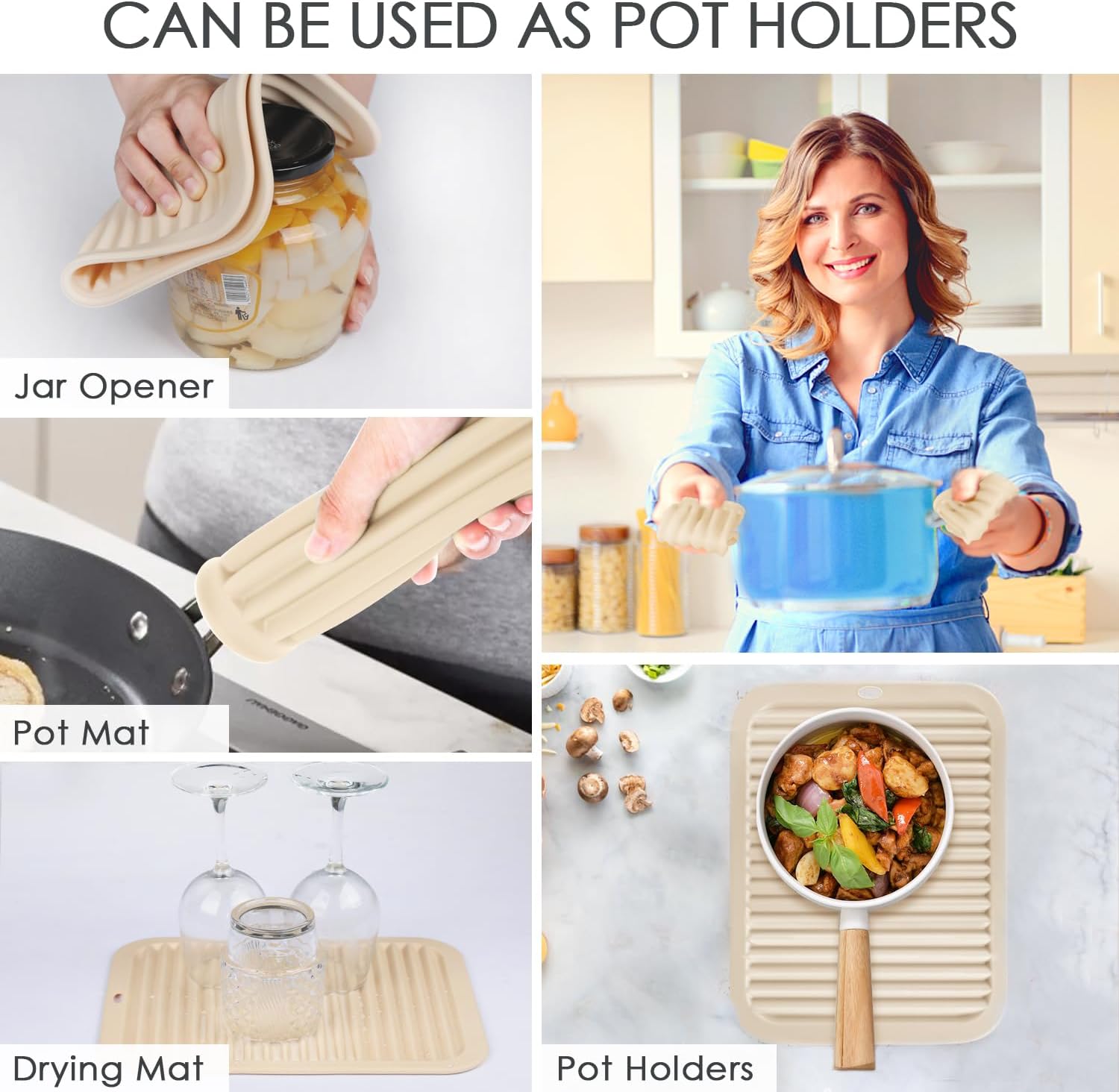- 【VERSATILE KITCHEN TRIVETS】: It is perfect as a silicone hot pad or anything in the kitchen that needs a silicone pad. One beige trivets for hot dishes replaces at least four kitchen gadgets. We can use the beige silicone trivet as a potholder, small dish drying mat, silicone placemat, jar opener, coffee maker mat, garlic peeler, or teapot mat for other kitchen utensils.