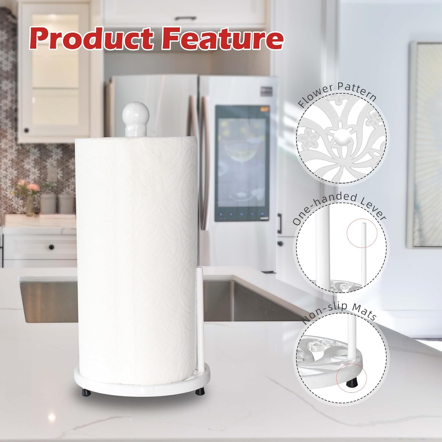 Vintage Paper Towel Holder Countertop - Cast Iron Standing Roll Paper Towel Dispenser with Elegant and Heavy Daffodil Pattern Base for Kitchen Décor, White