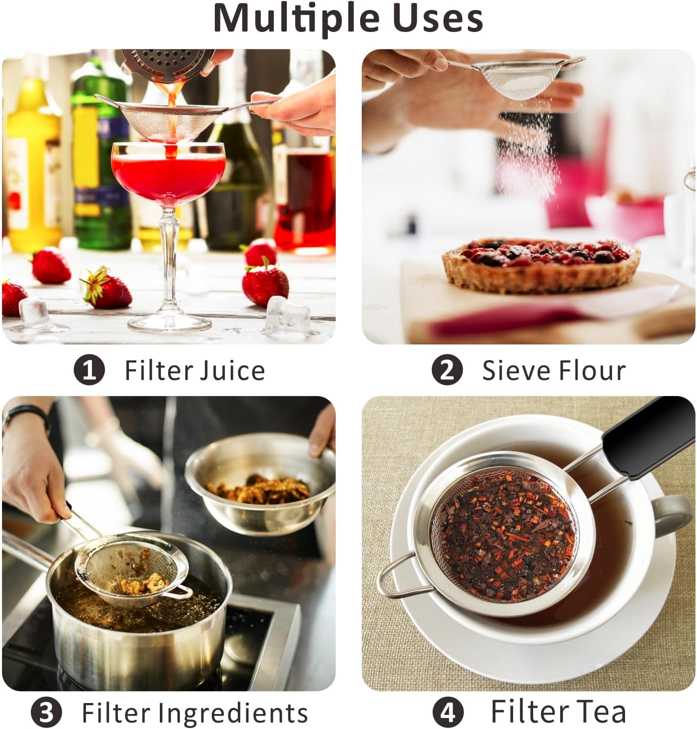 - NO WASTED FOOD-The stainless steel strainers nets easily catch and sifting or straining wet or dry ingredients. All sizes of fine mesh strainer feature a sturdy polished and seal steel ring wire frame, prevent food from getting trapped between the mesh and the rim. The rust-resistant fine double screen increases the load capacity of the kitchen strainers.