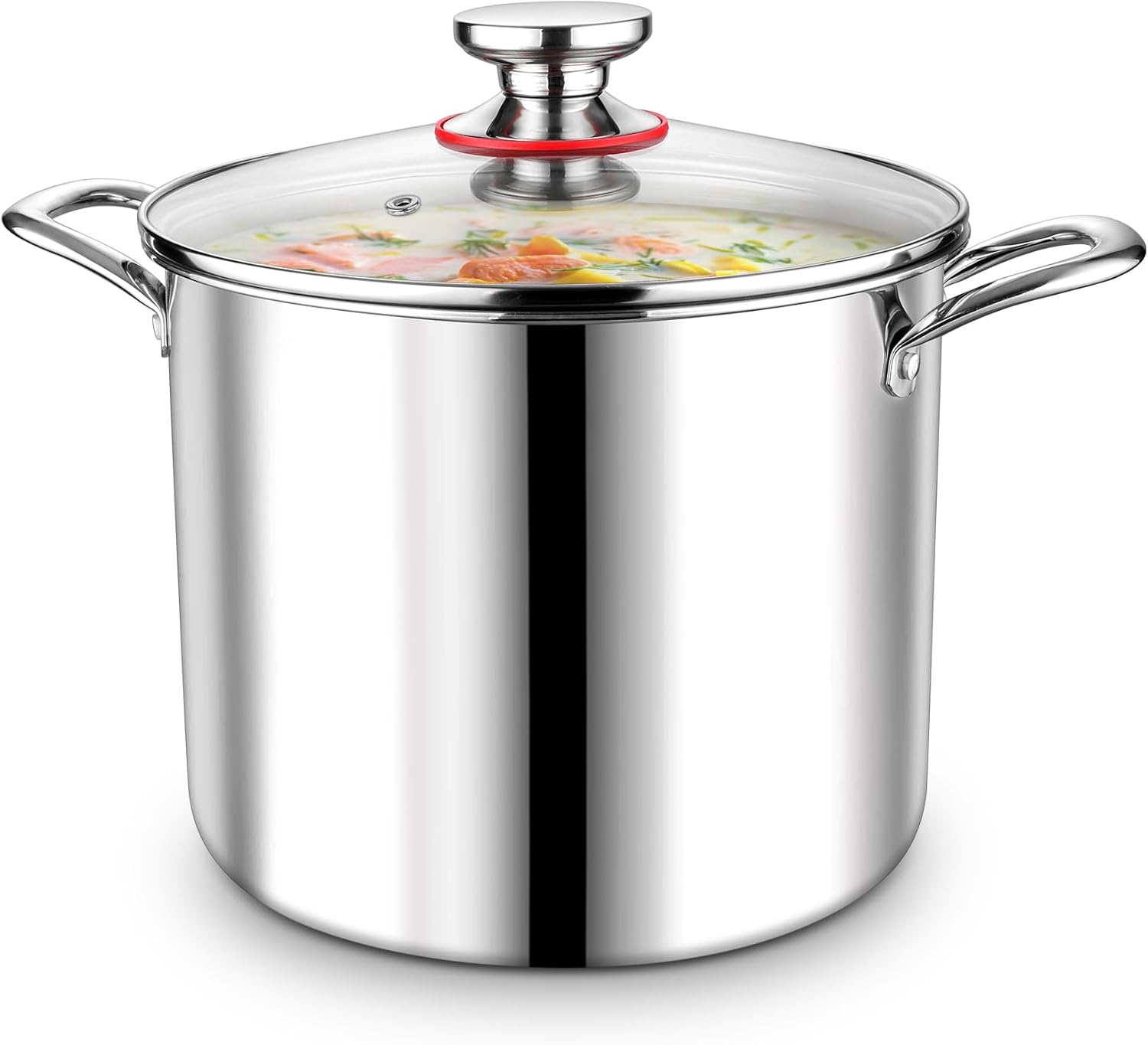 P&P CHEF 10 Quart Tri-Ply Stainless Steel Stockpot, Stock Pot with Visible Lid for Soup Pasta Vegetable, Induction Cooking Pot for All Stoves, Sturdy & Double Handle, Dishwasher Safe