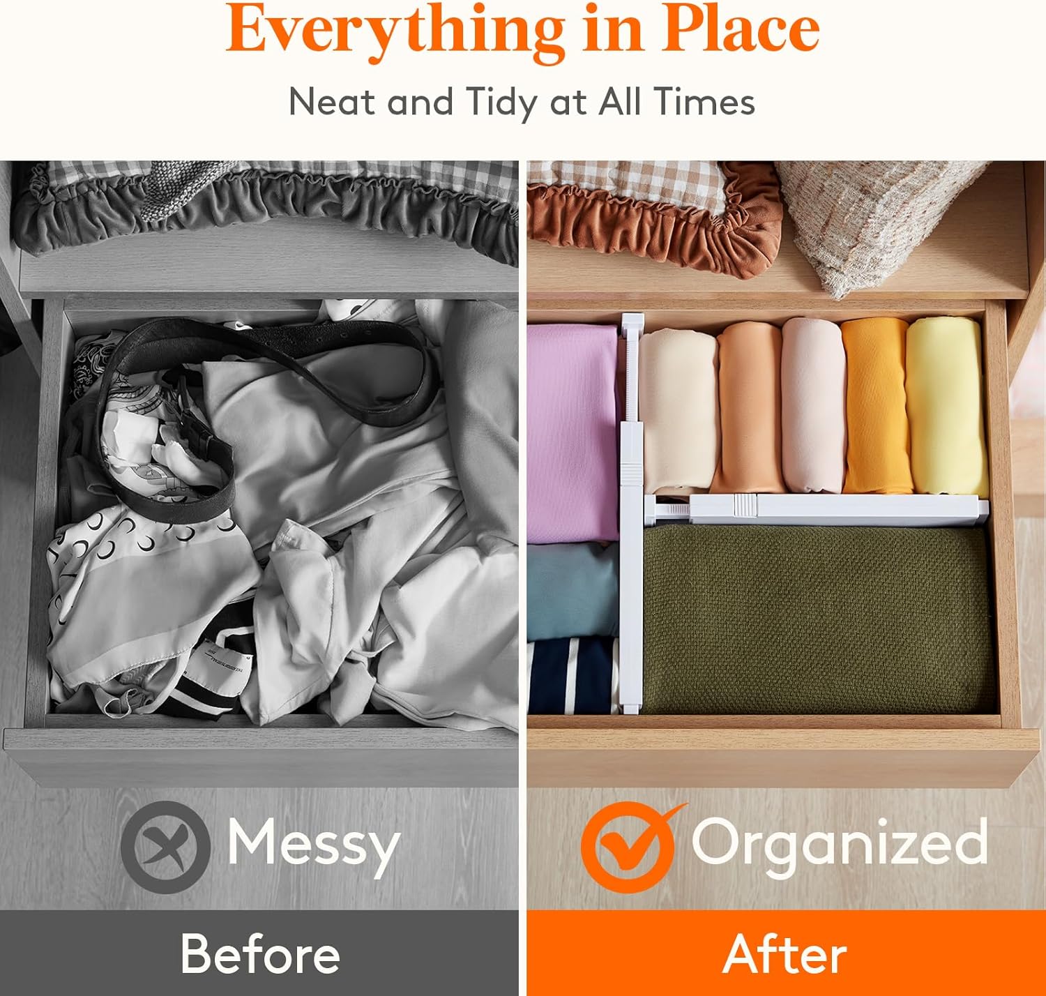 - Easy Installation & Removal: Press the top button to adjust the length before placing, and stretch it out again to secure it tightly before locking it. The strong spring tension keeps each drawer organizer securely upright. To retract, press the top button and push the stretched side.