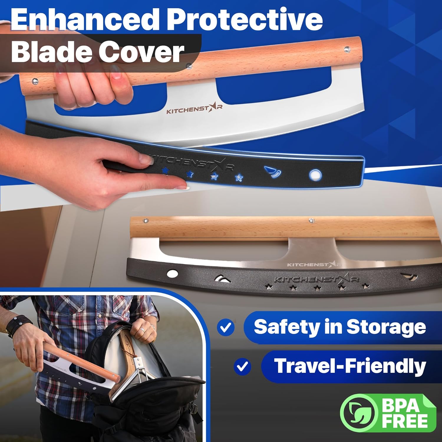 KitchenStar 16-Inch Pizza Cutter Rocker Blade - Razor Sharp Stainless Steel Slicer Knife, Stylish Beech Wood Handle, Protective Cover - Professional Pizza Oven Accessories, Silver