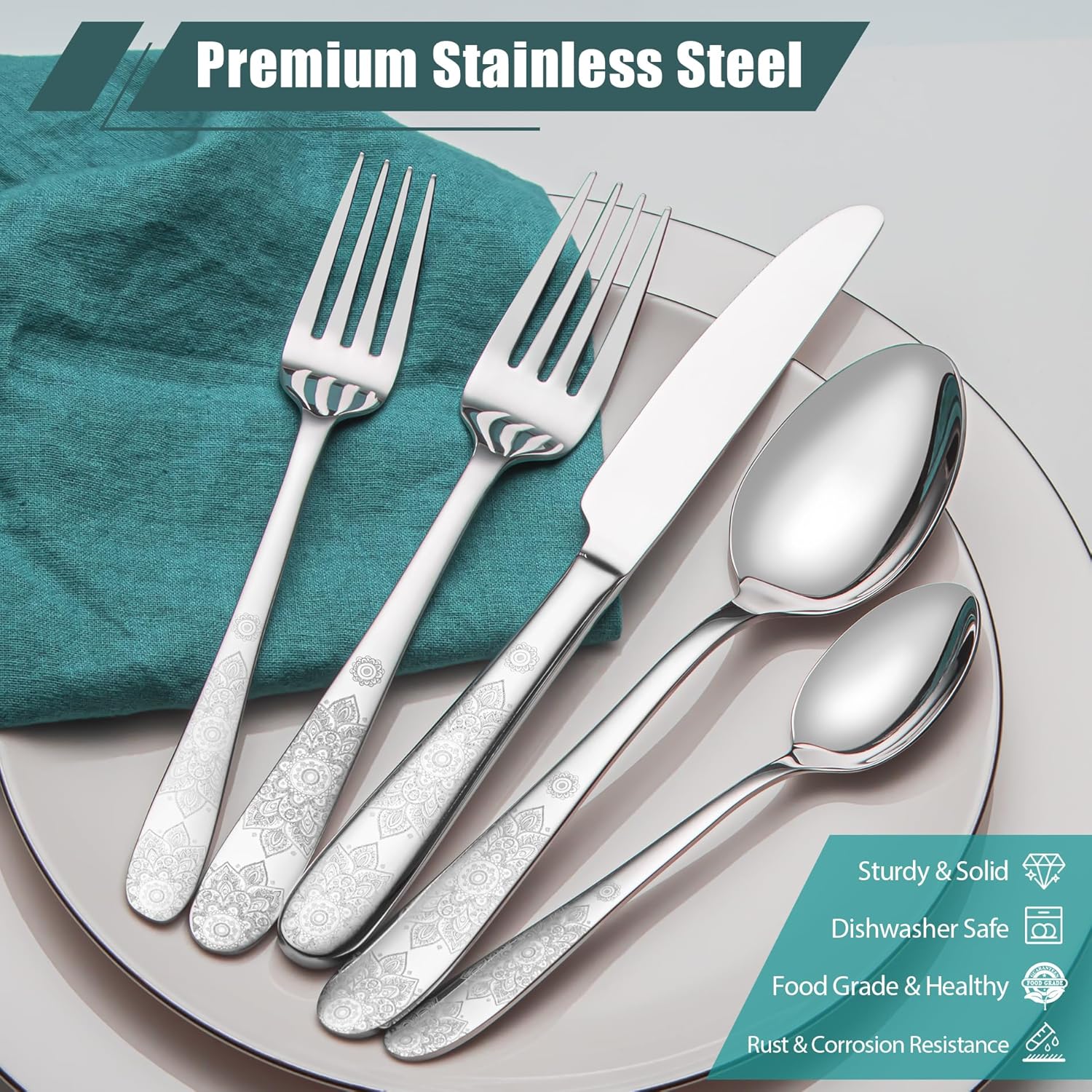 - ăUnique Silverware Set with Beautiful Pattern HandleăOur flatware set for 8 is designed with beautiful laser prints of flowers, unique styles make your dining table special, standing out from the ordinary tableware, and unique silver finish pattern design brings modern and stylish to the silverware sets impresses your family and friends when they come round for dinner