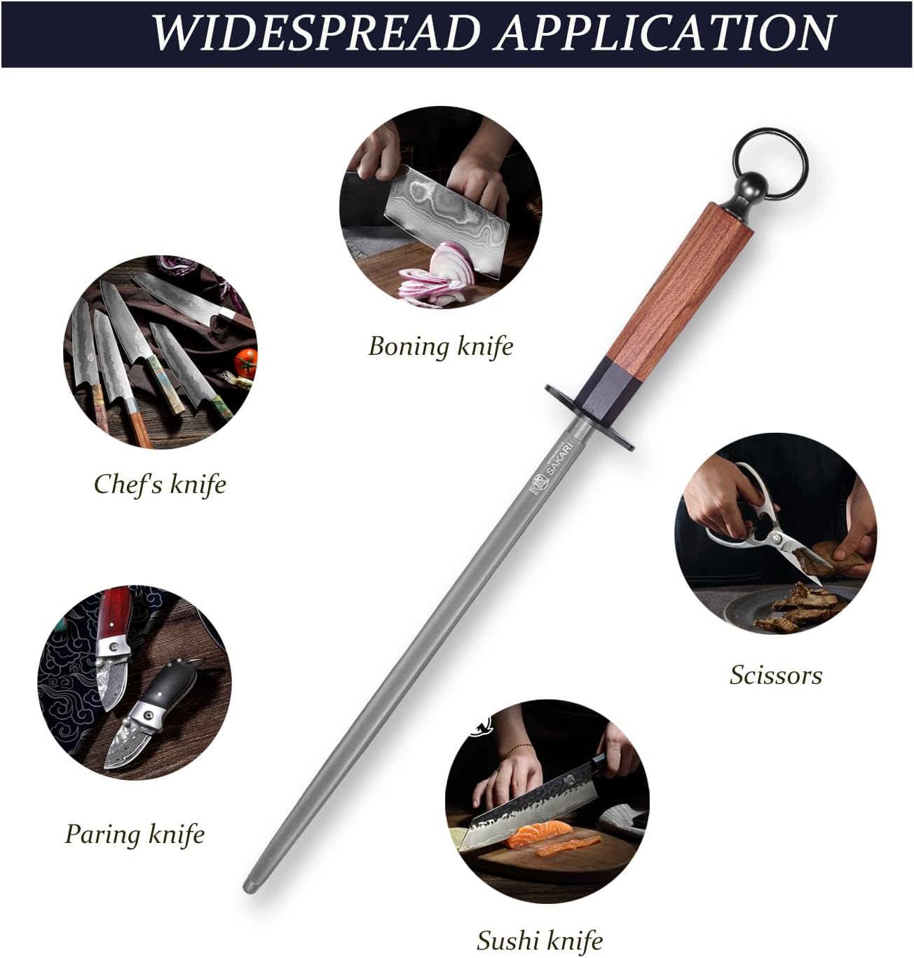 - Superb Craftsmanship Treatment: Black diamond sharpening rods use surface carbonization technology to improve the hardness and excellent durability. The honing rod is strictly magnetized to keep metal particles from being inhaled or falling onto food