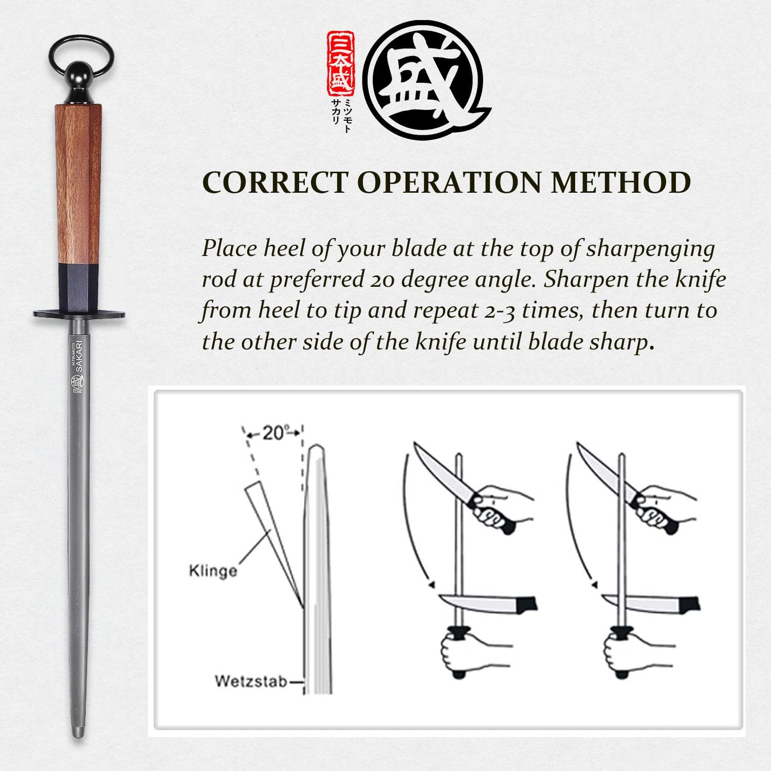 - Knife Sharpener Rod Use Note: MITSUMOTO SAKARI products have passed strict quality audits. If you encounter any problems when using your chef's knife, please provide us with suggestions. Our service team will give you a satisfactory solution