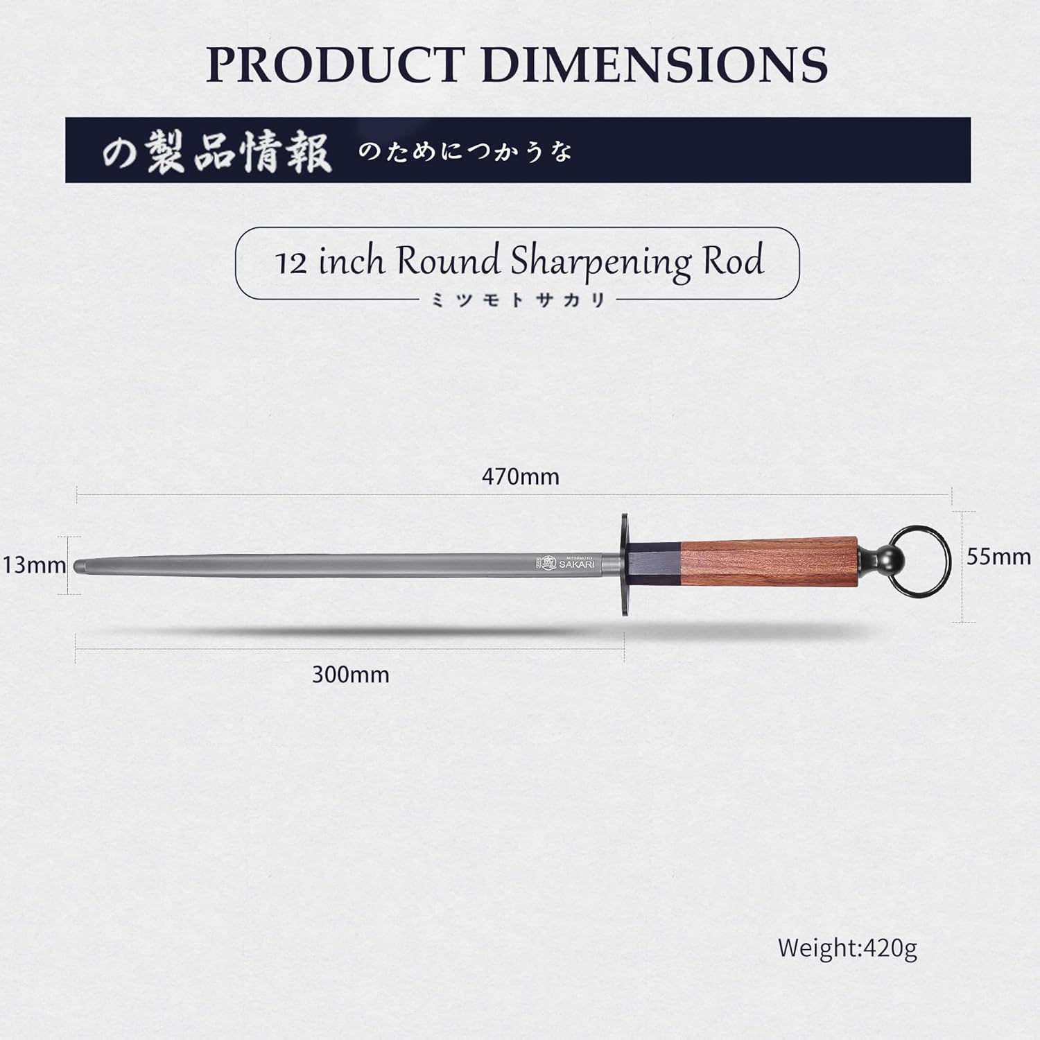 MITSUMOTO SAKARI 12 Inch Round Honing Rod, Japanese High Carbon Honing Steel (Sourwood Handle)