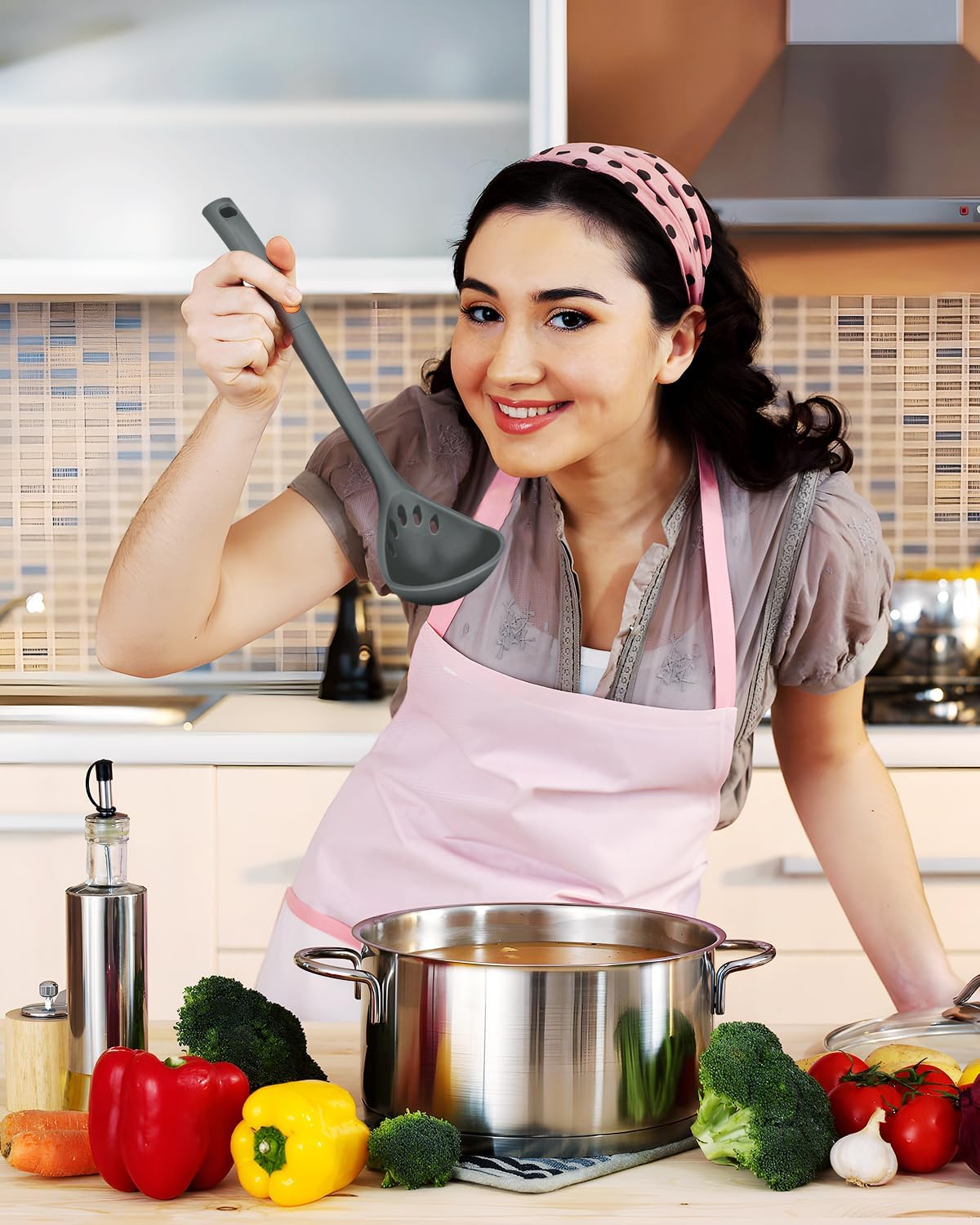 Silicone Pasta Fork and Ladle Spoon Set, Large Non Stick Kitchen Utensils for Cooking,Stirring,One Piece Serving Spaghetti, Soup, Sauce (GREY)