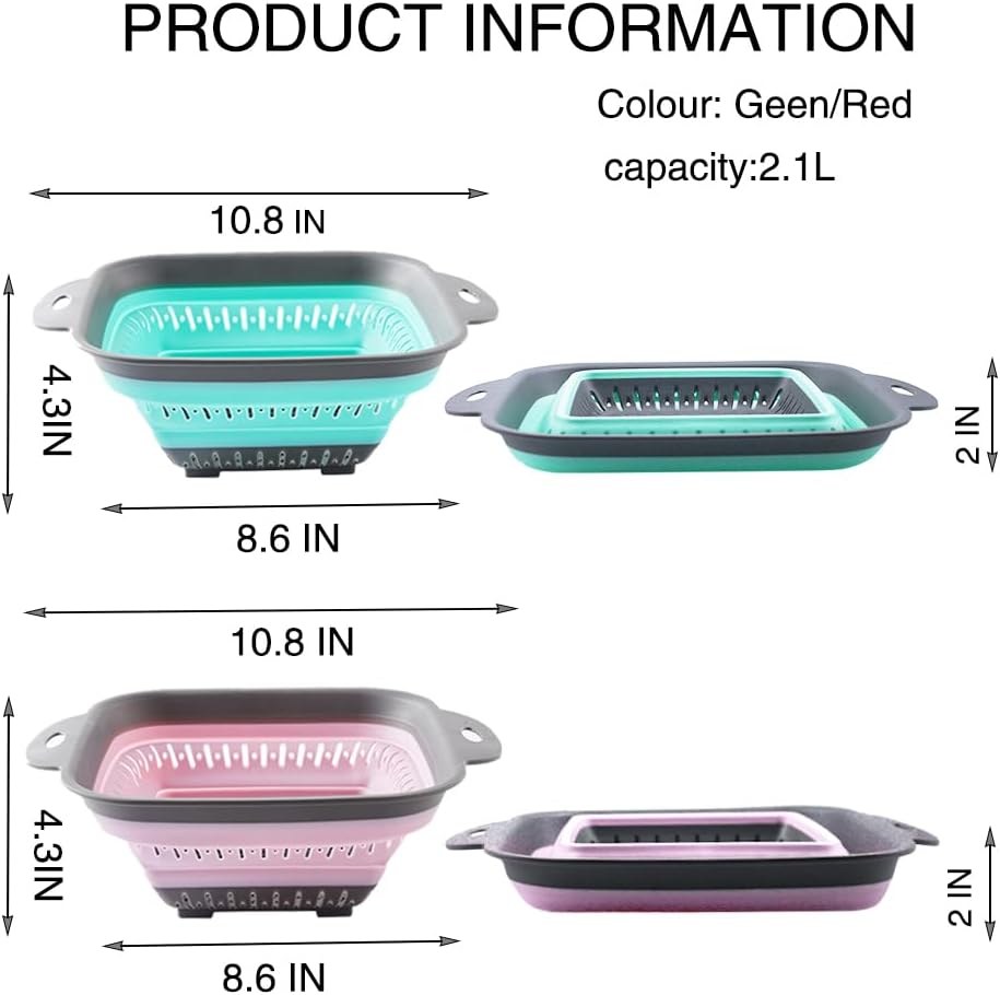Collapsible Colander Set, Square Round Triangles Silicone Kitchen Strainer Perfect for Draining Pasta Vegetable fruit 2 PCS (10.8"L x 8.6"W x 2"H, Red & Green)