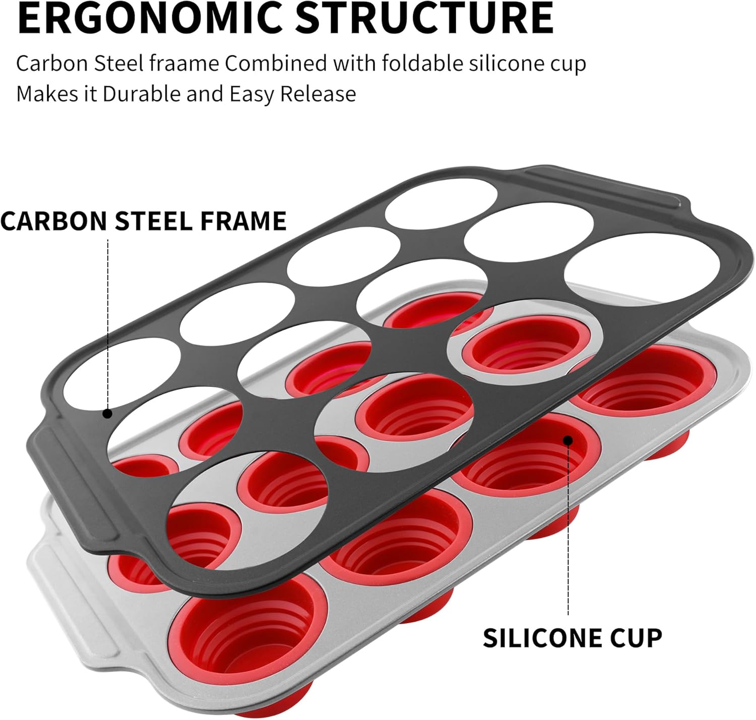 - Easy to use– The metal reinforced frame allows you to put the silicone muffin pan in the oven safely and stably without a baking sheet. The foldable cups are designed to pop out the baked cake easily by pushing up on the bottom