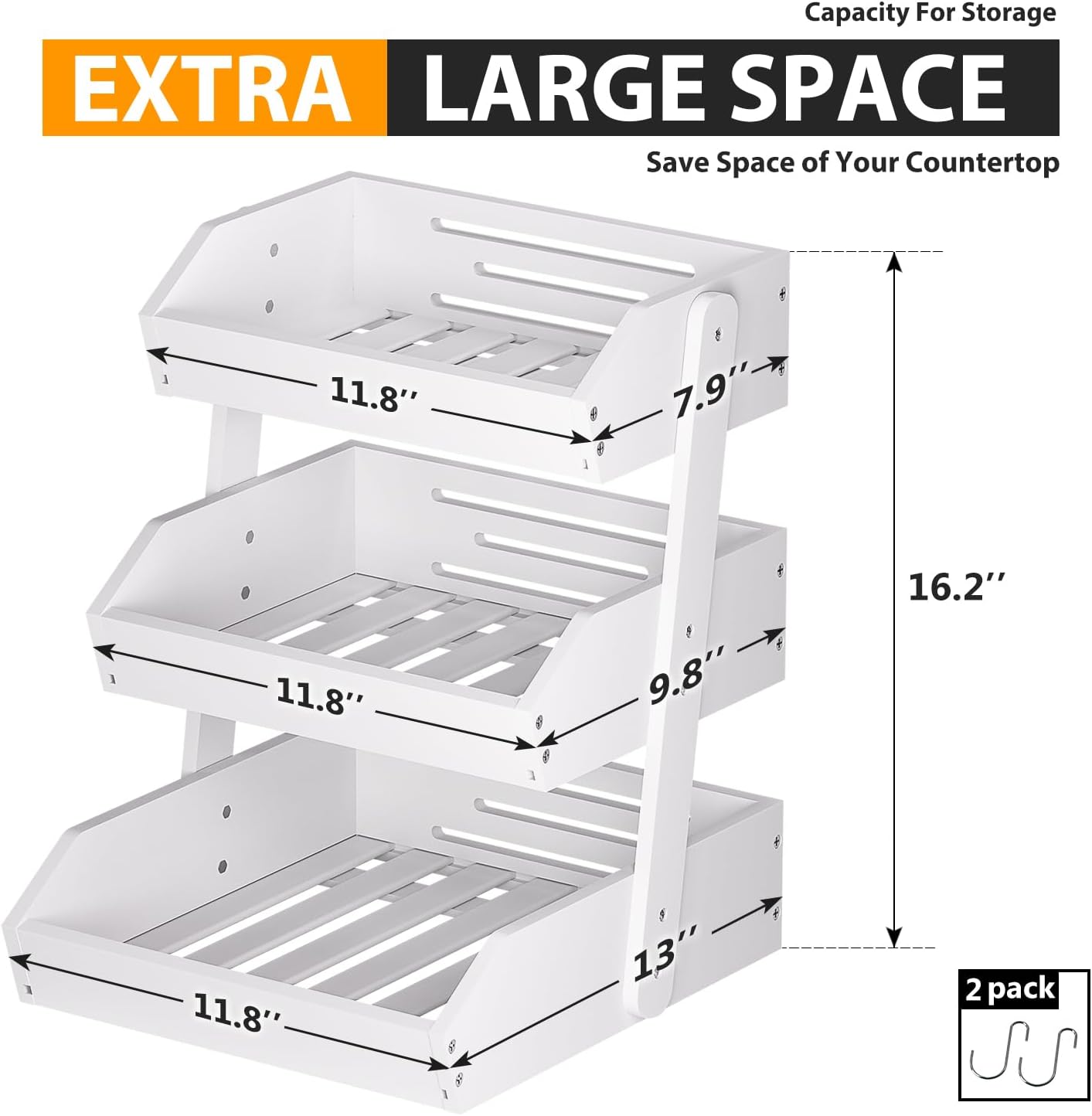 Bamboo Fruit Basket for Kitchen– 3 Tier Fruit Bowl For Kitchen Counter, Large Fruit Holder With Banana Hangers, Idea For Vegetable Storage, Bread Display, Snack Organizer(White)