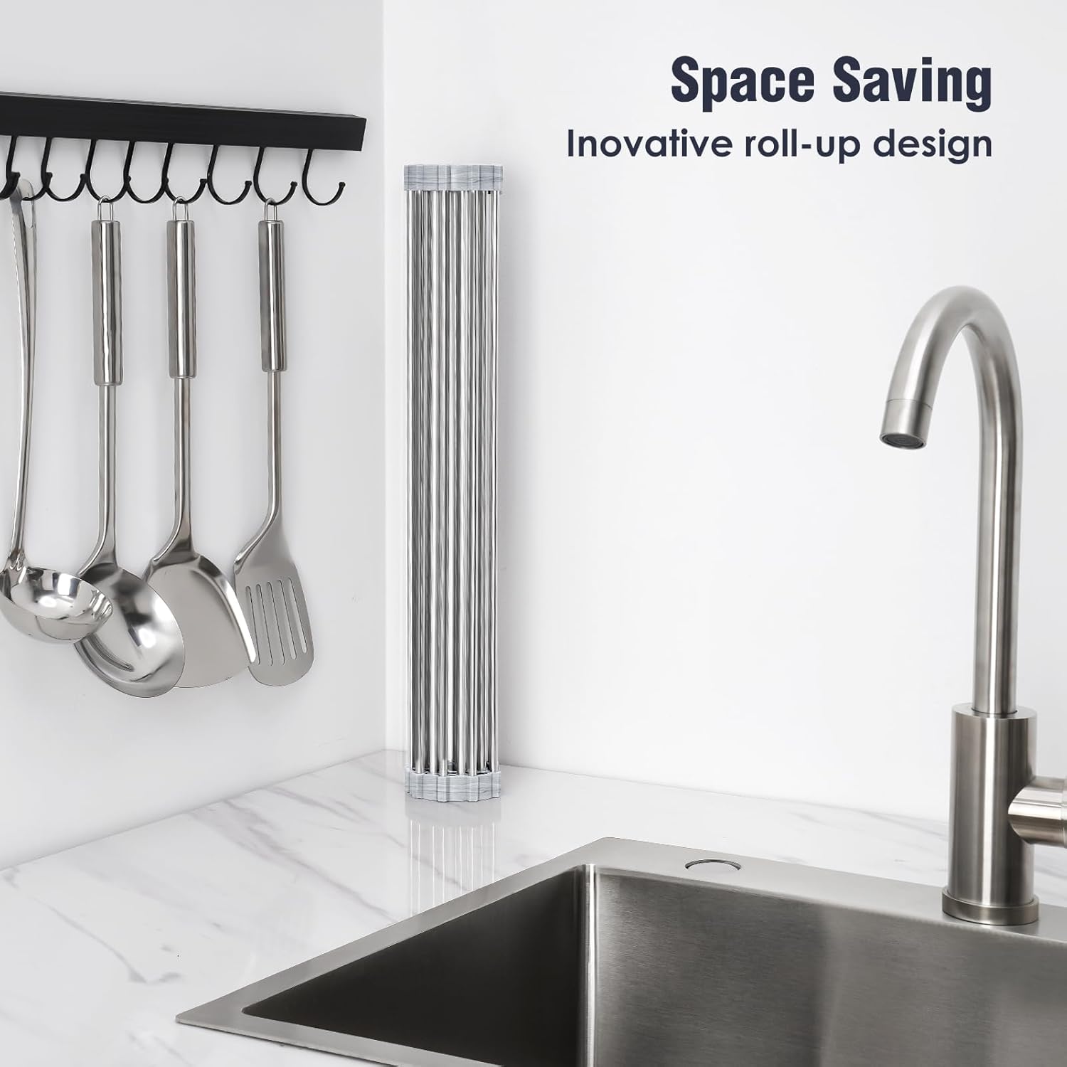 Tomorotec Stainless Steel Roll-Up Dish Drying Rack Marble Color Silicone Edges, Foldable Kitchen Rack Heat Resistant Trivet Supports up to 70 lbs, Food Safe for Dishes, Cookware & More