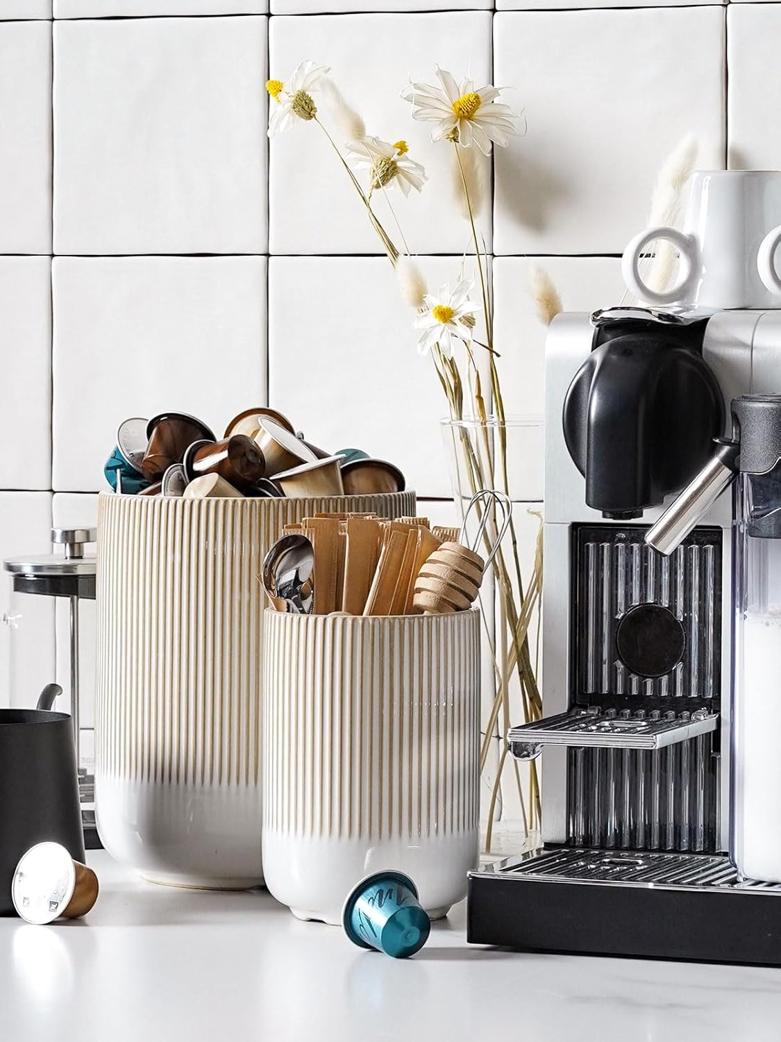 - Multi-Functional Utensil Holder: These kitchen utensil holders do more than just store cooking utensils; They also double as elegant vases, offering a stylish home for hair tools like combs, and can seamlessly house coffee pods and stirrers on your bar countertop; Their versatility knows no bounds
