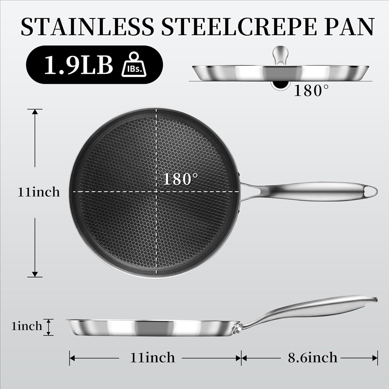 - 【MULTIFUNCTIONAL COMPATIBLE】The stainless steel Crepe Pan can be used in any kitchen and can meet your needs for frying eggs, steaks, omelets and more. It can be used on induction, gas, ceramic and electric stovetops to create more possibilities for your recipes.