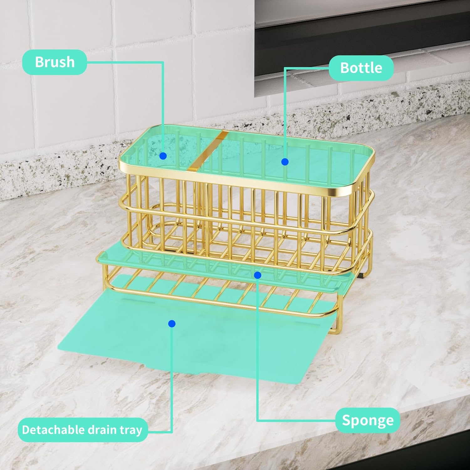 HapiRm Multifunctional Kitchen Sink Organizer with Removable Drain Tray, Quick Draining Rustproof Sink Caddy, Stainless Steel Kitchen Sponge Holder for Holds Sponge, Cleaning Towel and Scrubber - Gold