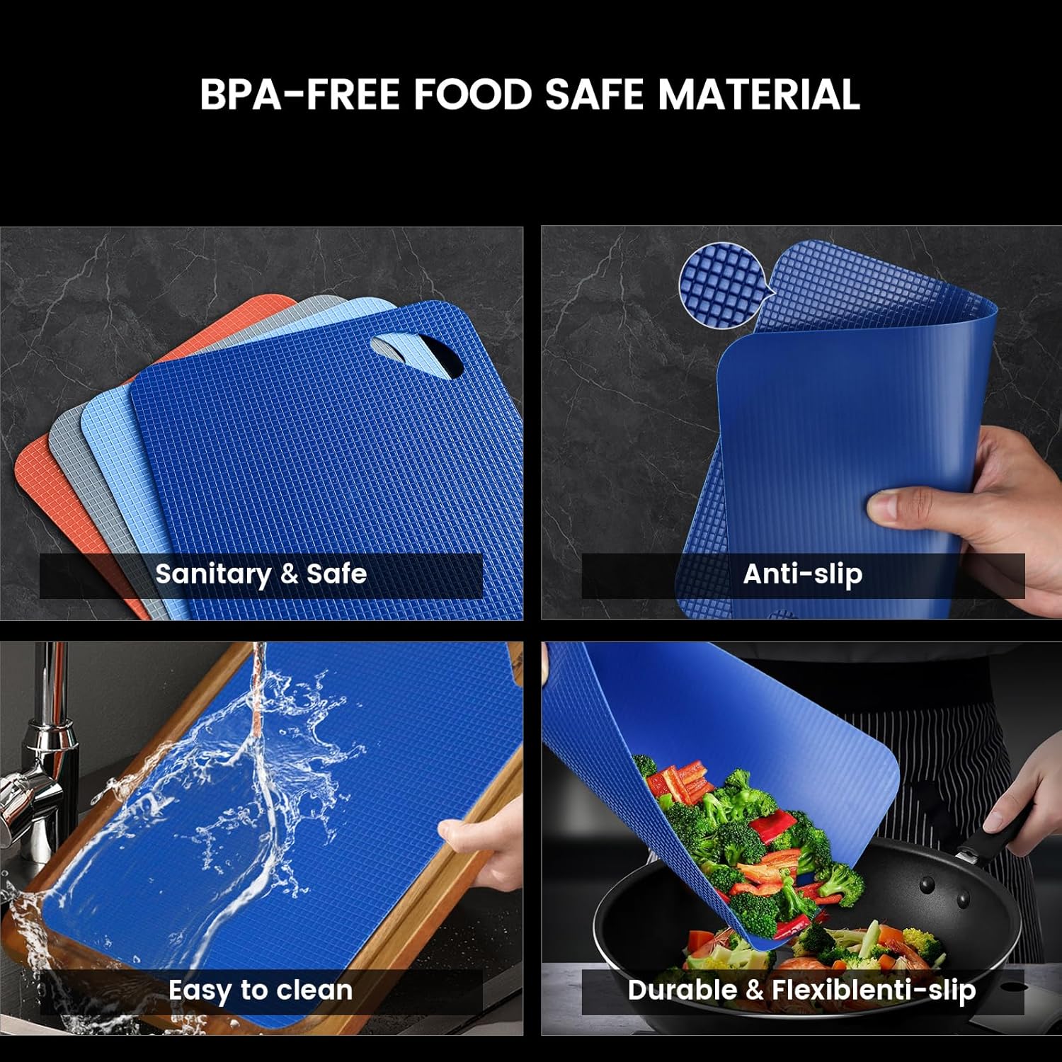 - [Get Efficiency and Protection with Cutting Board Mat] Our colorful plastic cutting board mats, constructed from food-safe grade PP material, offers flexibility and a non-slip surface. The high-density plastic material is dishwasher-safe, ensuring effortless cleanup. Furthermore, it can be easily rolled up, providing reliable stability when transferring food. The non-slip cutting board mat on the front of the butcher block fits securely, preventing sliding and knife scratches