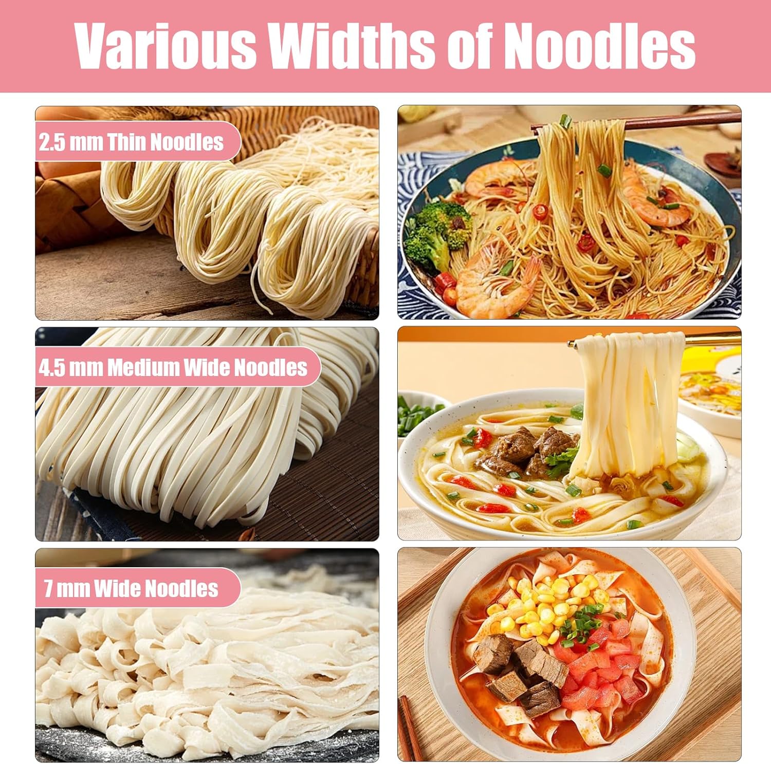 - ăAdjustable settingsăIt is designed with six adjustable thicknesses (0.01-0.20inch), allowing you to freely adjust by the knob for making pasta wrappers, dumpling wrappers and more. It also provides three widths of 2.4 mm, 4.5 mm, and 8 mm to choose from, which can meet your needs for making different noodles.
