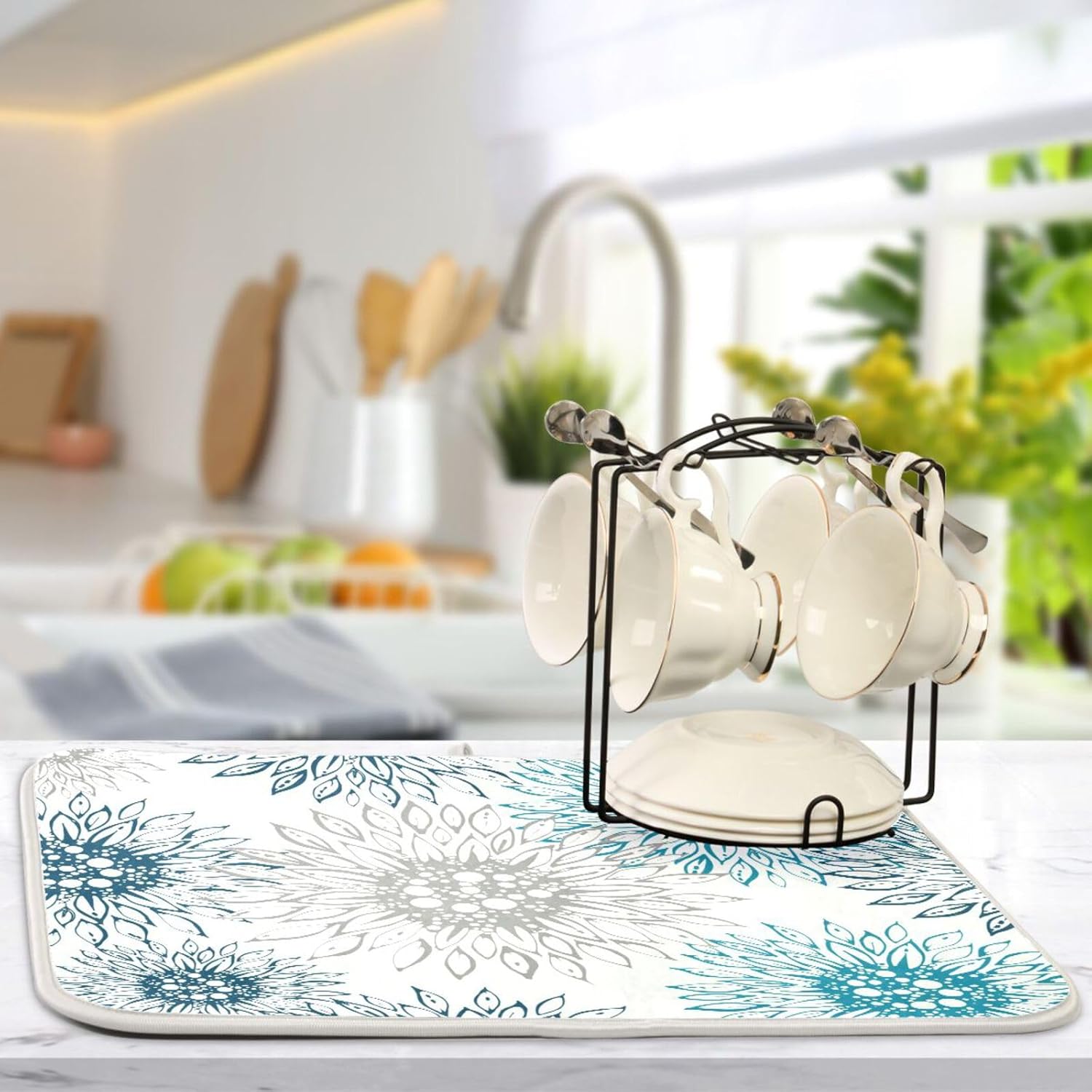Abstract Flowers Sunflowers Dish Drying Mat for Kitchen Counter Absorbent Microfiber Drying Pad, Medium 16x18 in, Blue White Reversible Drainer Mats
