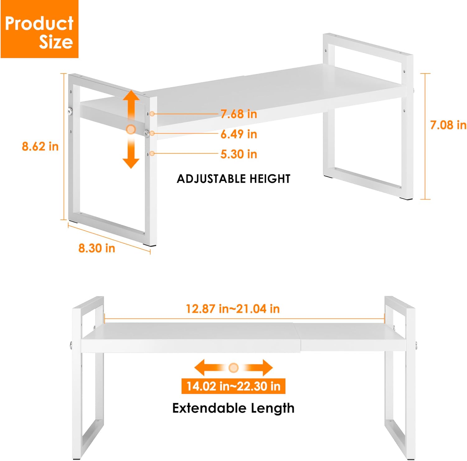 - ăExpandable & Stackable Cabinet OrganizerăThe length and height of this shelf can be adjusted, The length of expandable shelf can be adjusted from 12.87 to 21.04 Inches according to the different space; The Height can be adjusted from 5.3 inches to 7.68 Inches depending on how you want to arrange your space.