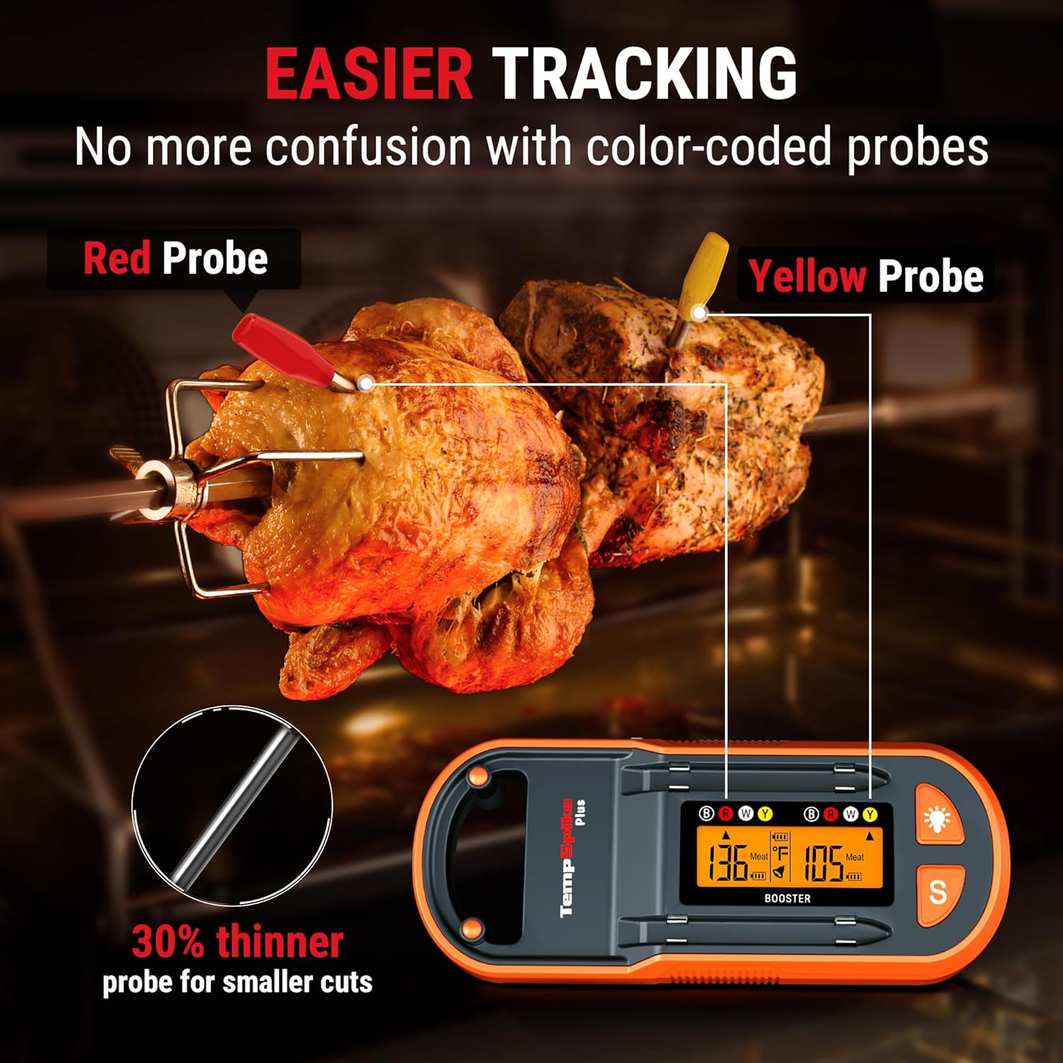 - ăFaster to TrackăThoughtfully designed with color-coded probes, this turky thermometer allows you stay organized with simple and distinct color markings, much easier to identify than other wireless grill thermometers marked with number