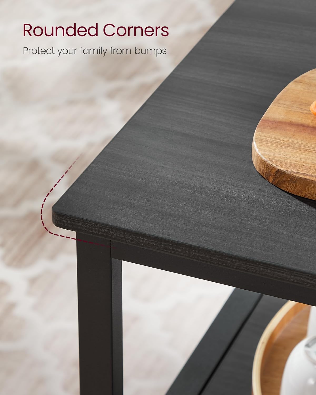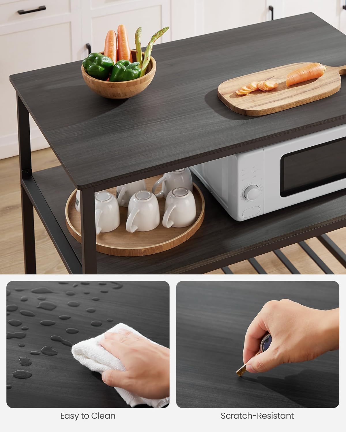 - [3-Tier Storage] Place a flower vase or a tea set on the top, kitchen appliances on the middle shelf, and storage boxes with bakeware on the lower grid shelfâeverything is nicely organized on this 3-tier Island table with easy access
