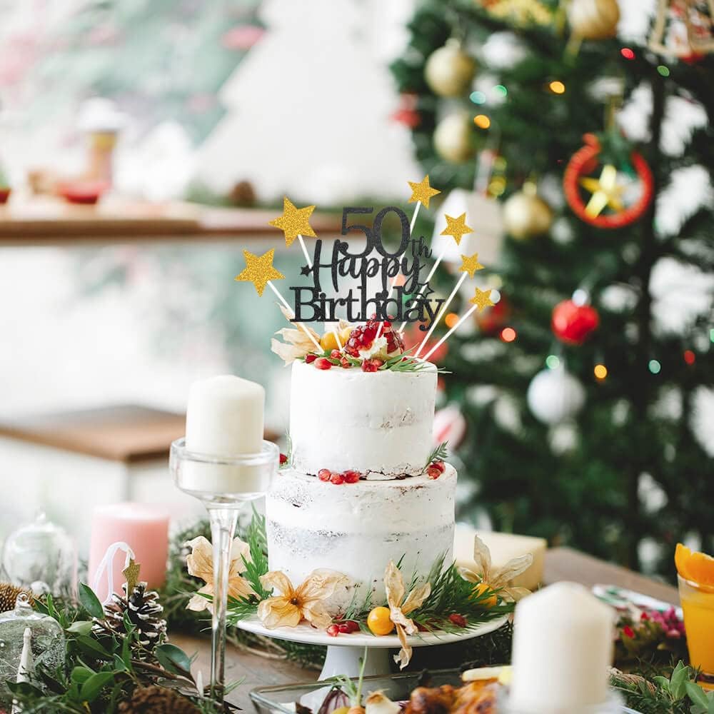 Glittery 50th Happy Birthday Cake Topper with Star,Personalised 50 Birthday Cake Toppers Party Decorations Party Supplies for Men Women Black Gold