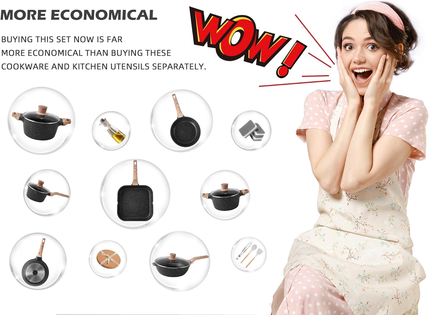 Caannasweis Pots and Pans Set, Nonstick Kitchen Cookware Sets, Granite Pots and Pans, Cooking Pans Pots Set (Classic Black, 20 Piece Grill Pan Set)