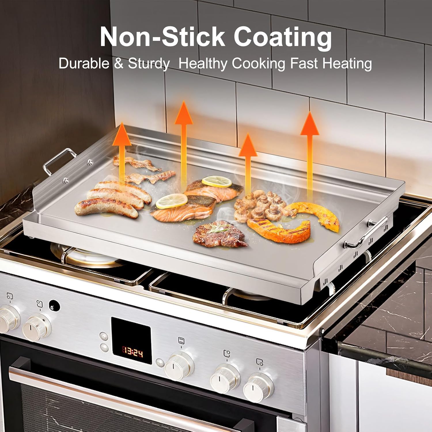 YORKING 23" x 16" Nonstick Coating Griddle Flat Top Grill Plate, Stainless Steel Griddle Plate with Grease Groove and Removable Handles for BBQ Charcoal/Gas Grills, Parties, Indoor/Outdoor Cooking