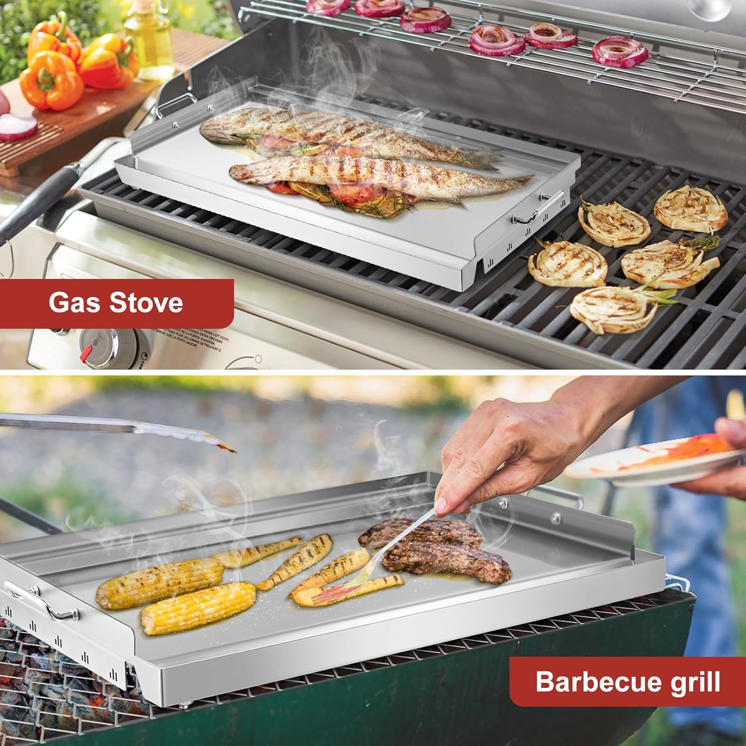 - UNIVERSAL METAL NONSTICK GRILL-TOP GRIDDLE: Suitable for any gas grill/charcoal grill, gas stove, and can fit perfectly on the grills, ensuring the most even heat distribution. You can cook pancakes, bacon, eggs, vegetables, shrimp, salmon, etc. Ideal for camping, gatherings, barbecues, and other activities.