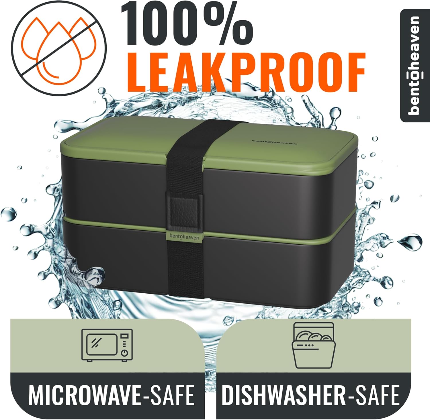 Bentoheaven Premium Bento Box Adult Lunch Box with Compartments for Women & Men, Set of Utensil & Chopsticks & Dip Container, Cute Japanese Kids Bento Lunch Box, Microwavable (Olive Garden)