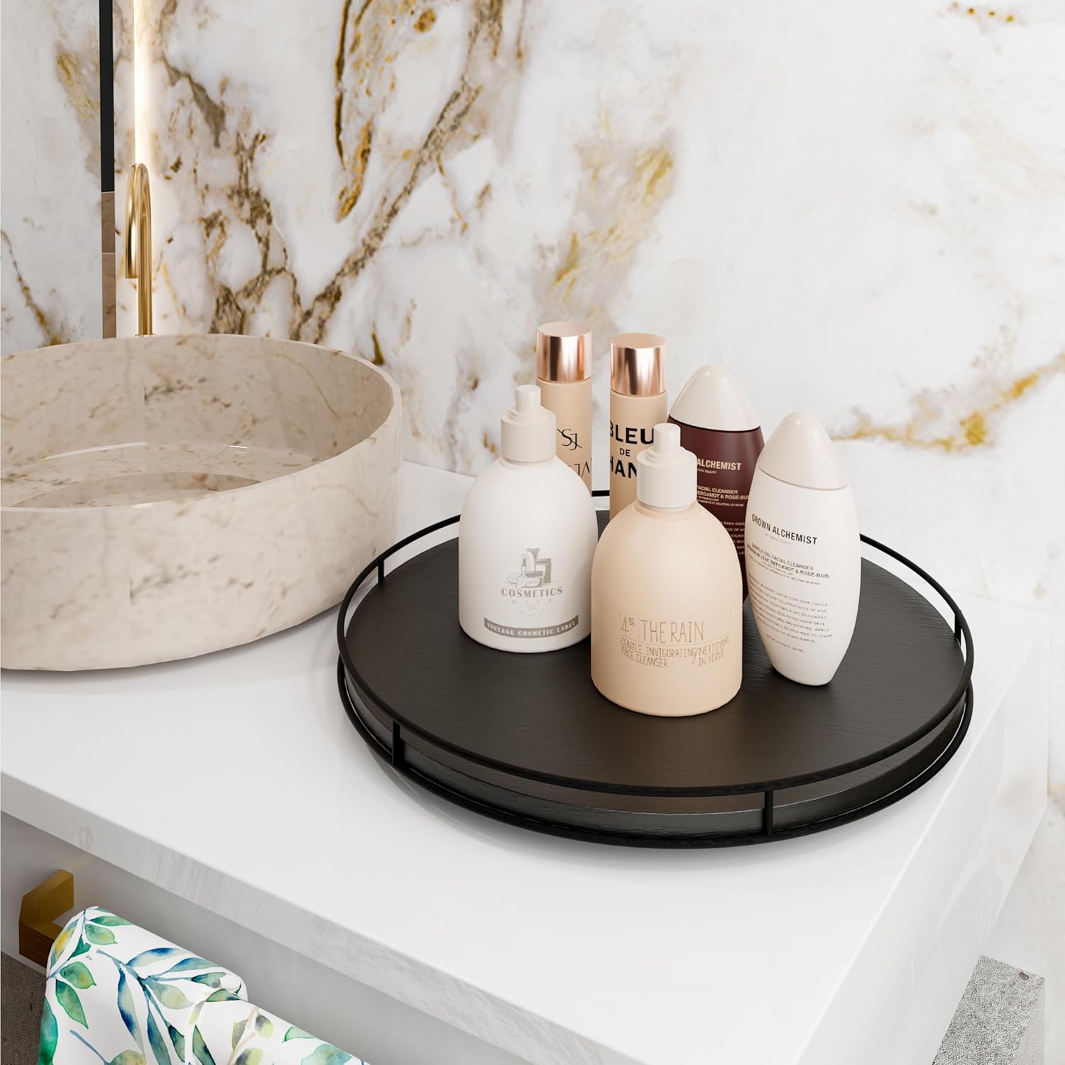 18" Acacia Wood Lazy Susan Turntable with Metal Frame for Table Top - Large Black Rotating Organizer Countertop Storage - Wooden Serving Tray for Charcuterie Cheese Board - Kitchen Counter