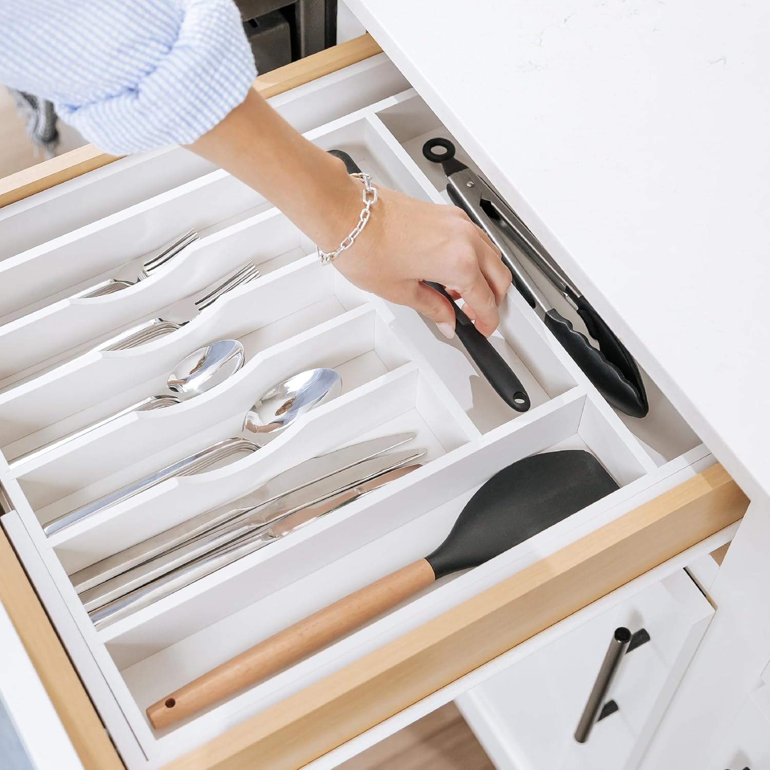 - MAXIMIZE YOUR DRAWER’S STORAGE CAPACITY: This 10-compartment (8 fixed + 2 adjustable) white organizer measures 17.4” long x 2.7” tall and expands from 14.5” to 25” wide (and any width in between). Most other bamboo organizers expand to 22” wide and are only 2” tall. It’s amazing how much storage capacity an extra 0.7” in height adds when filling your organizer full of flatware and utensils!