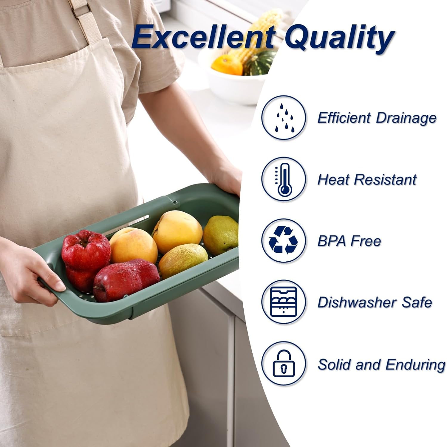 Extendable Sink Colander Strainer Basket - Wash Vegetables and Fruits, Drain Cooked Pasta and Dry Dishes - Adjustable Over the Sink Colander Collapsible Drainer Basket - Green