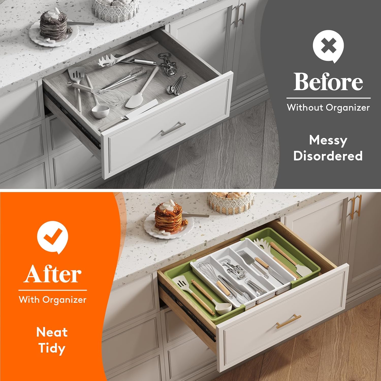 - Sort Your Silverware: The silverware tray comes with 3-5 compartments, creating more space in drawers for spatulas, ladles, tongs, utensil sets, and whisks. Streamline your cooking with a no-install organizer that keeps cutlery at your fingertips