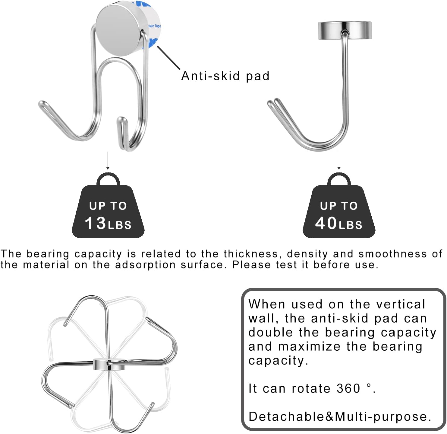 - 【Real strong magnetic force】There is a high standard strong magnet on the back. The maximum bearing capacity is 40LBS for horizontal wall, and for vertical wall is 13LBS. The load bearing value is the average value measured by hanging dumbbells on multiple products (refrigerator, iron frame, etc.) in the real scene, not the ideal value measured by the instrument.Please pay attention to the direction of use. All magnet hooks need be attention. For the vertical wall, please stick anti-skid mat on the back , which generally doubles the bearing capacity.