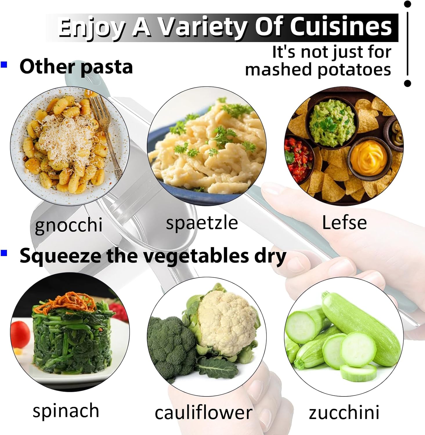 - 【Efficiently Make Fluffy Mashed Potatoes】With 3 mm ricing hole and extra hole, 15 OZ Large-capacity potato ricer can quickly make a lot fluffy mashed potatoes. You can quickly get enough mashed potatoes for your family without having to repeat the potato masher many times.